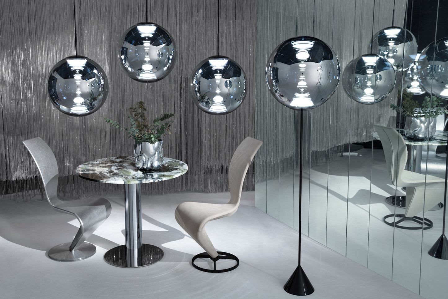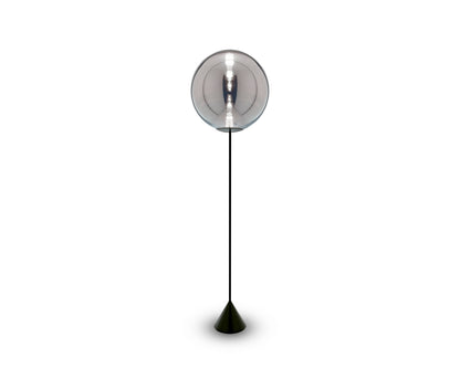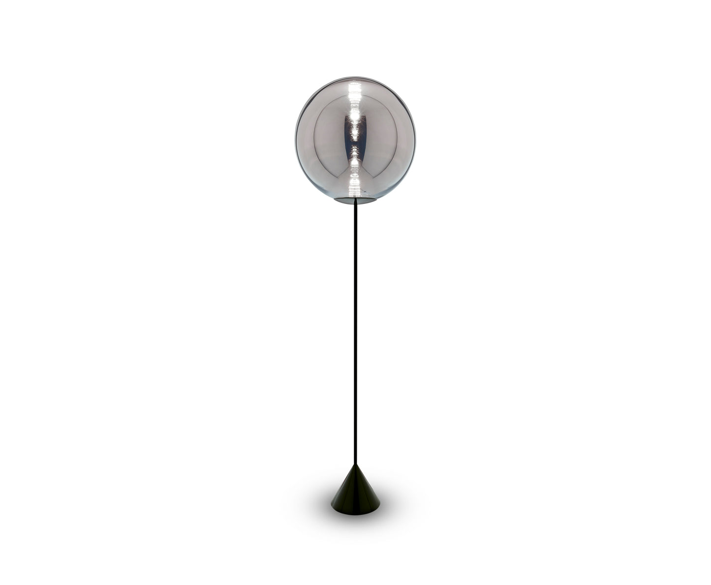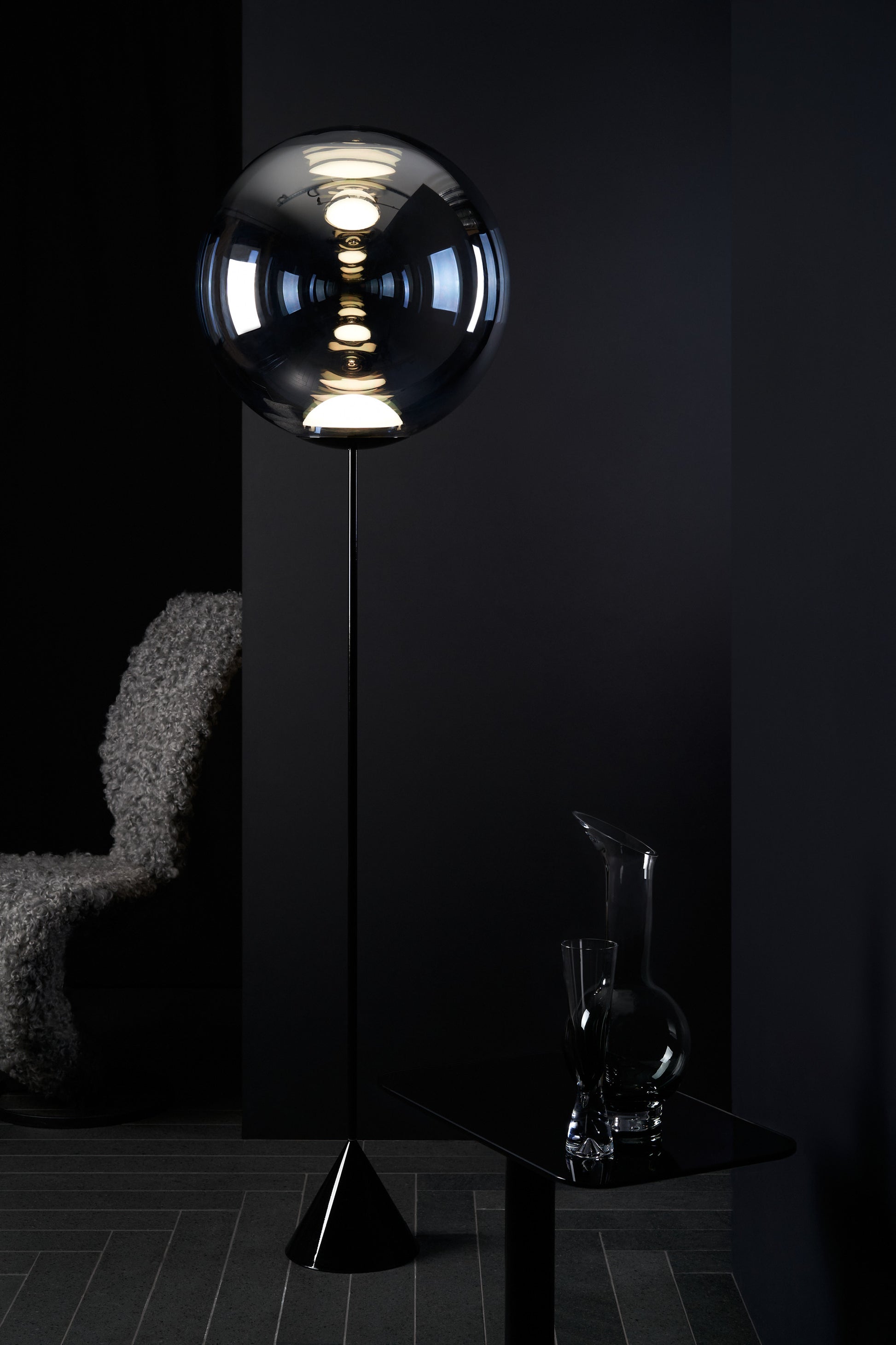 Le lampadaire à LED Globe Cone présente une armature fine et noire avec une base conique et un abat-jour en forme de sphère, qui constitue la principale caractéristique du luminaire. Lorsque le luminaire est éteint, le polycarbonate réfléchissant reflète les autres objets de la pièce. Dès que le lampadaire est allumé, l'ampoule LED installée à l'intérieur est visible et la lumière blanche chaude est émise directement créant ainsi des effets de lumière atmosphérique.