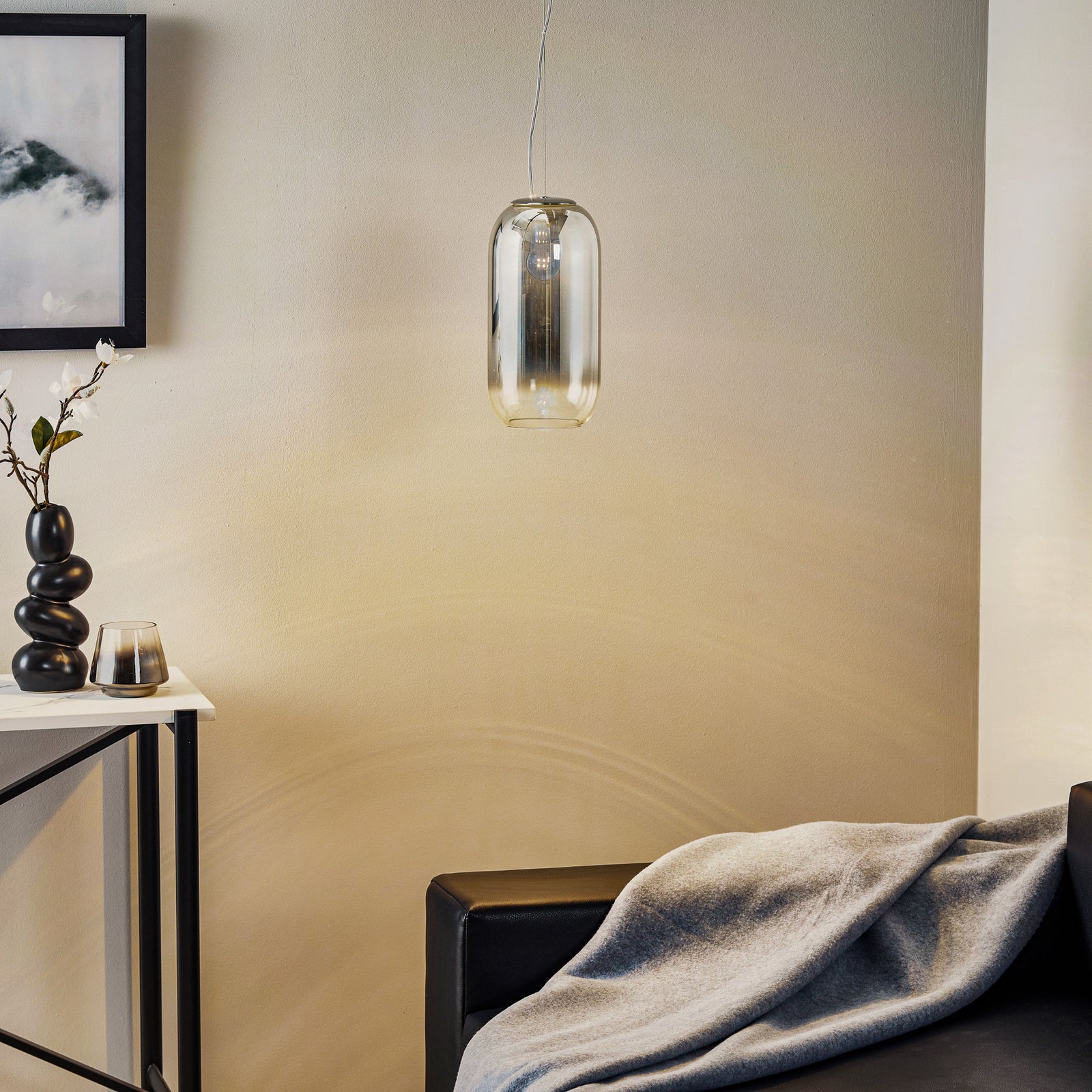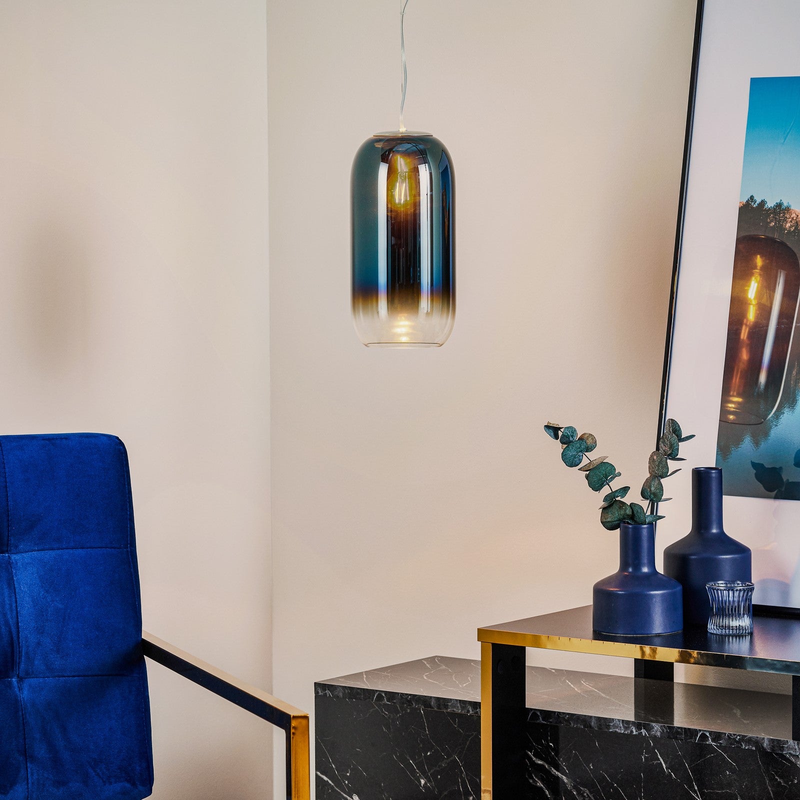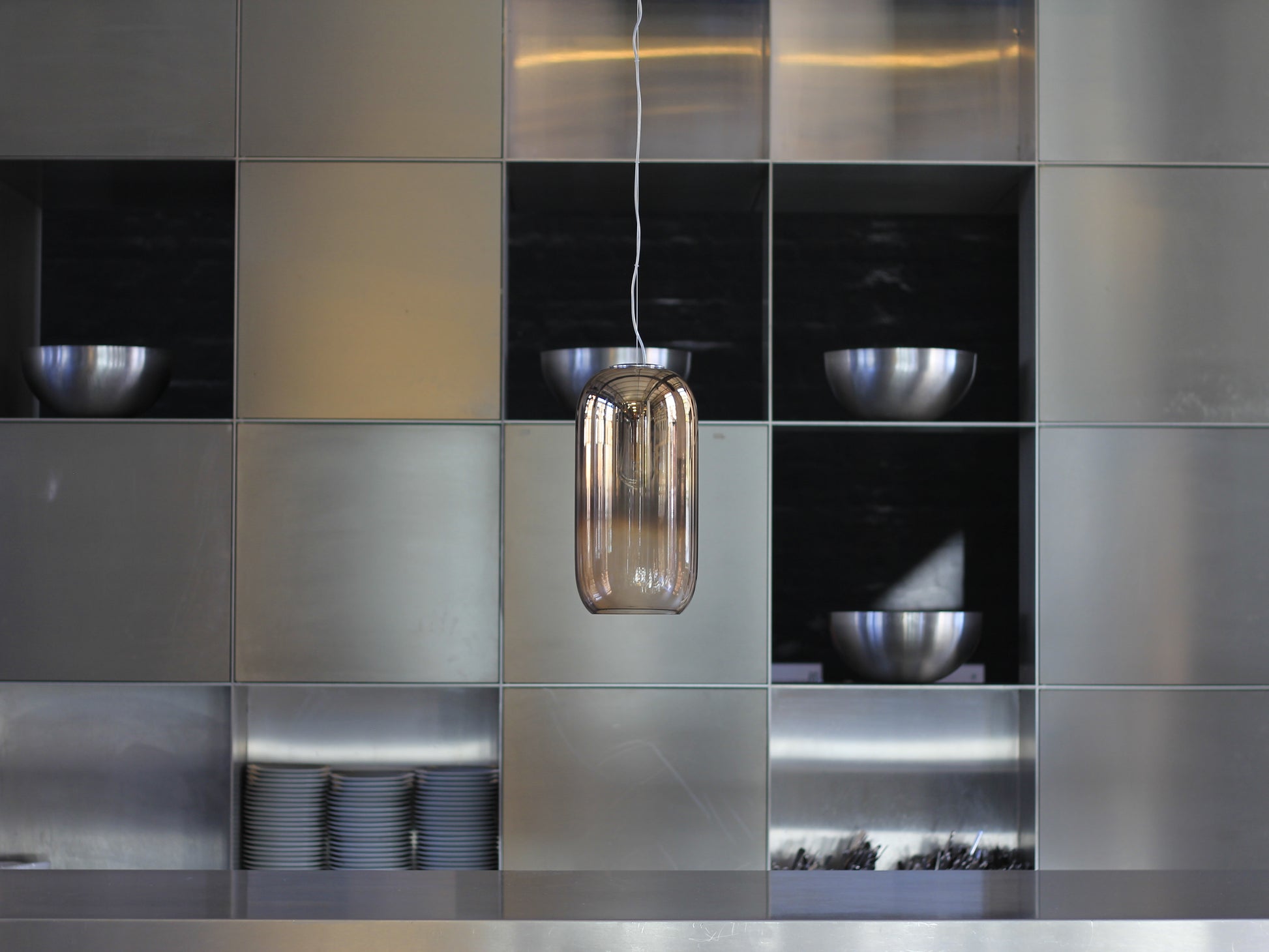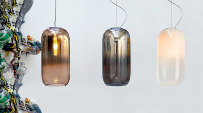 La forme organique et pure de la suspension Gople exalte la beauté du verre soufflé. Ce luminaire est travaillé selon une ancienne technique traditionnelle vénitienne afin d’obtenir une coloration particulière. Tourné vers l'avenir, Artemide a également utilisé une technologie innovante de métallisation sous vide. Subtilement teinté, le verre présente un superbe effet de dégradé. La couleur opaque sur le haut de l’abat-jour devient de plus en plus translucide en descendant. A la manière d'un nuage qui se désintègre dans le ciel, Gople semble se dématérialiser peu à peu, marquant de moins en moins son empreinte dans l'espace. Un effet très poétique qui relève d'un exceptionnel travail artisanal du verre. Le diffuseur en verre masque la source lumineuse tout en optimisant l’émission directe grâce à la transparence. Fabriquée artisanalement en Italie, chaque lampe est une pièce unique. La suspension Gople existe également avec un système RWB qui favorise la photosynthèse et aide vos plantes à se développer (nous consulter pour plus d’infos).