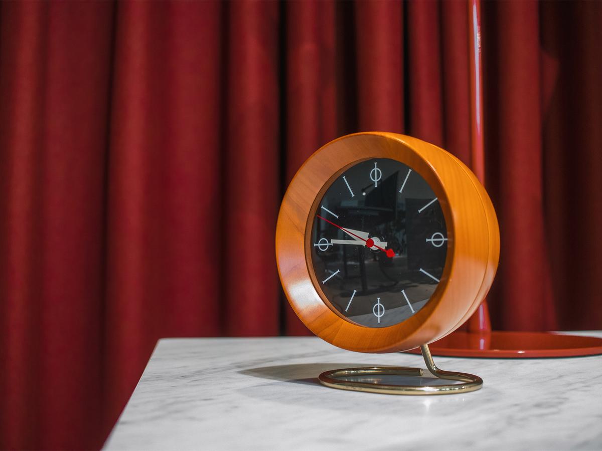 En 1947, le designer américain George Nelson a été chargé de créer une collection d'horloges. Nelson a analysé la façon dont les gens utilisaient les horloges et a conclu qu'ils lisaient l'heure en discernant la position relative des aiguilles, l'utilisation de chiffres étant donc inutile. De plus, comme la plupart des gens portaient des montres-bracelets, il a supposé que les horloges étaient plutôt devenues des éléments décoratifs pour les intérieurs. Ces idées ont servi de base à la première collection de 14 pièces d'horlogerie, composée d‘un tout nouveau style d'horloges murales et d'horloges de table compactes, qui a été lancée sur le marché en 1949. Bien que les modèles aient tous une caractéristique commune – l'absence de chiffres – la diversité de leurs formes, de leurs couleurs, de leurs matériaux et de leur design n'aurait guère pu être plus grande. Au cours des 35 années qui suivirent, les Matériaux designers de Nelson Associates conçurent plus d‘une centaine de modèles d'horloges différents : horloges murales, horloges de table portables et horloges intégrées. Après la disparition de Nelson en 1986, le Vitra Design Museum acquiert sa succession qui comprend environ 7400 manuscrits, plans, dessins, photographies et diapositives datant de 1924 à 1984. Vitra a lancé la réédition des Nelson Clocks en 1999 et met à jour la collection de temps à autre. Les Desk Clocks sont disponibles dans différentes formes et matériaux. Équipés d'un mécanisme à quartz de haute précision, ils continuent d'offrir une alternative pleine de fraîcheur aux horloges classiques.