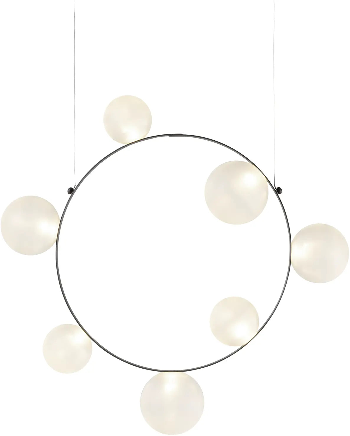 Hubble Bubble, conçu par Marcel Wanders, est une suspension aérienne et joyeuse. Elle est proposée avec 7 ou 11 bulles de LED en verre, disponibles en versions irisées ou givrées, posées sur un cadre métallique circulaire. Hubble Bubble peut être accroché à la fois horizontalement et verticalement. Hubble Bubble est une belle pièce décorative, qui pourra trouver sa place au dessus d'une table, dans une chambre ou une entrée.