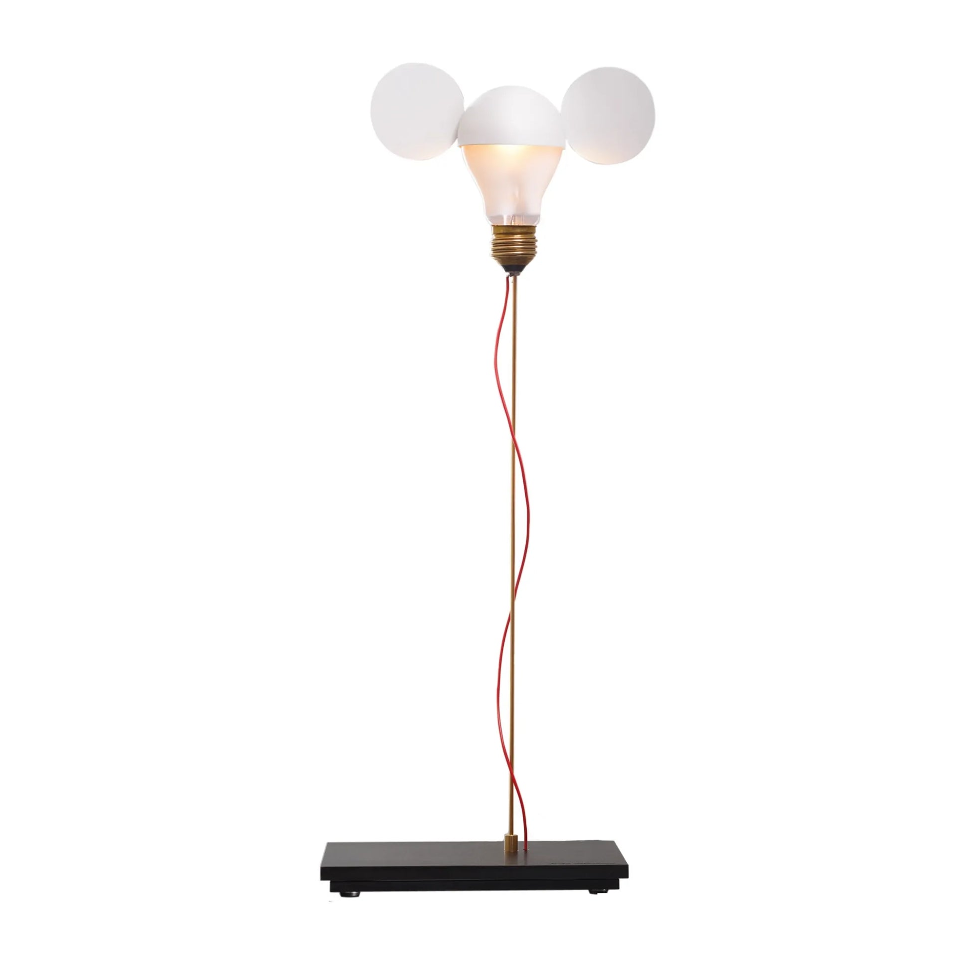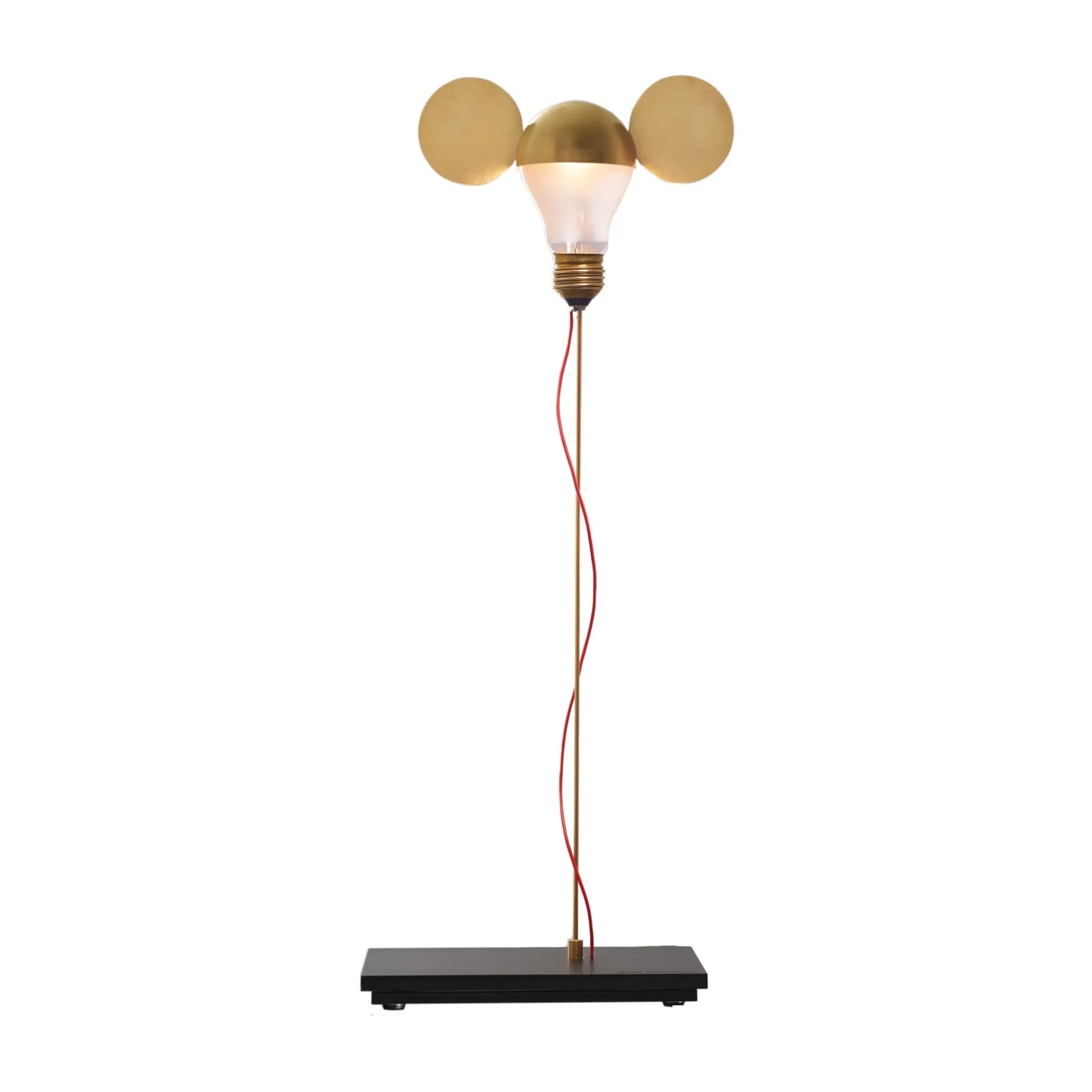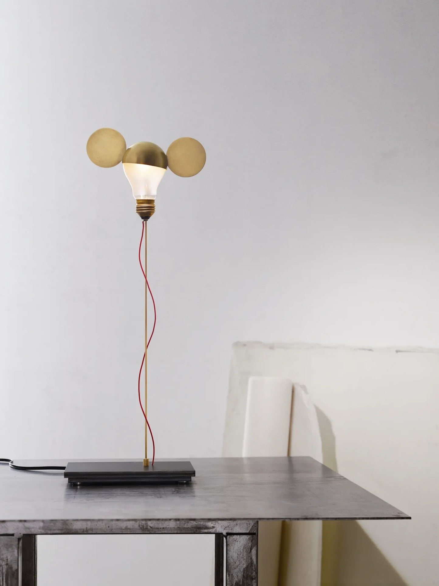 Ingo Maurer a imaginé une lampe ludique et charismatique qui semble s'inspirer du célèbre personnage de Walt Disney : Mickey Mouse. Cette lampe à poser met l'accent sur l'élément principal qui est l'ampoule. Elle est laissé comme brute, utilisée comme diffuseur habillé seulement d'un petit chapeau à oreilles en laiton. Cette lampe est livrée avec 2 ampoules halogène à bas voltage (une ampoule + une ampoule de rechange). Cette lampe est équipée d'un variateur de lumière à curseur, pour s'adapter à toutes les ambiances.