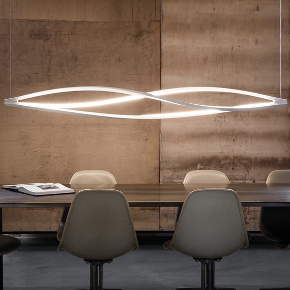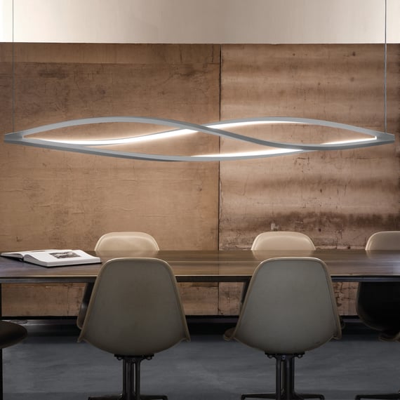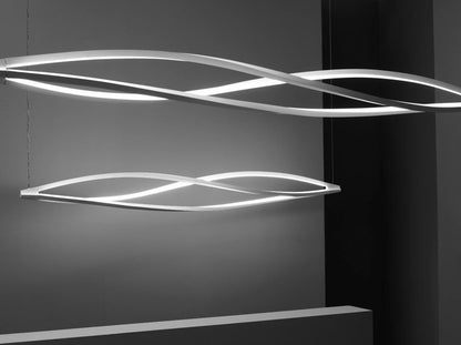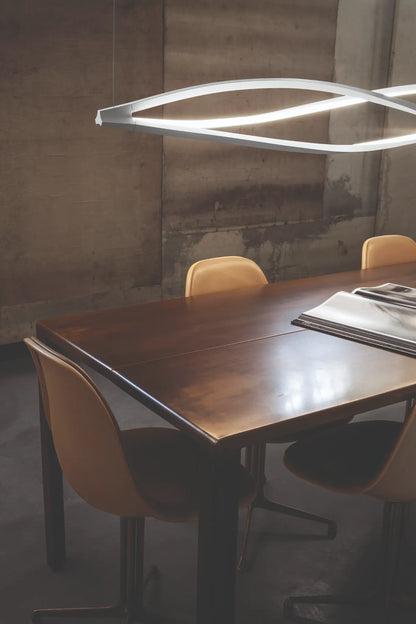 La suspension In the Wind est à la fois peu encombrante en hauteur, et donc parfaite pour des hauteurs sous plafond standard, et en même temps remarquable par sa forme. La forme de cette suspension est obtenue grâce à une technologie qui permet la torsion de l'aluminium, spécialement développée par Nemo. Cette suspension convient également pour les sorties électriques décentrées par rapport à la table.