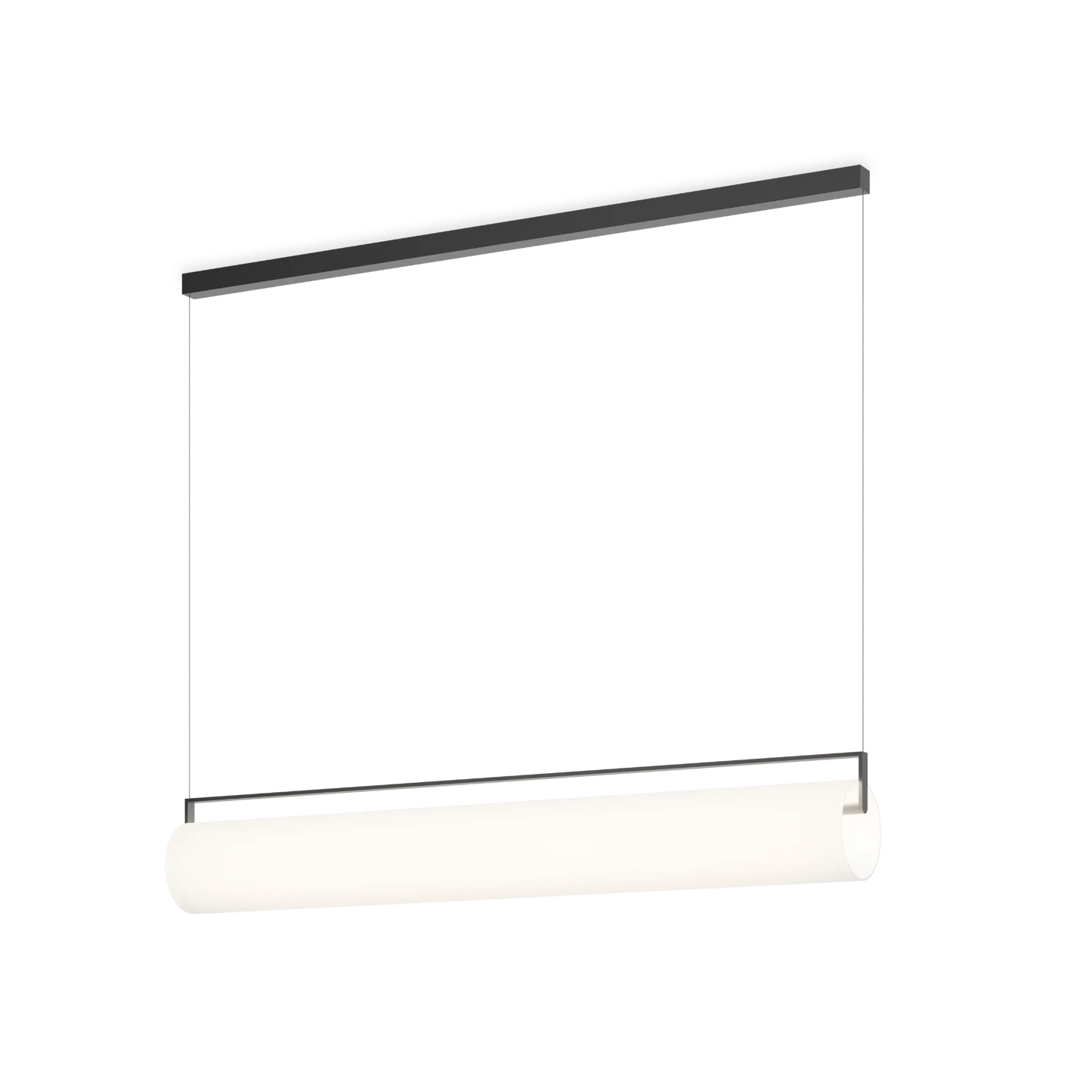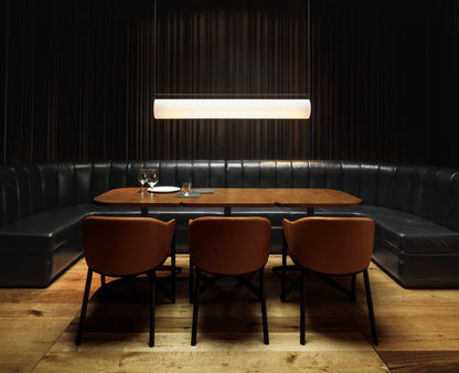 Cette suspension en verre se présente sous la forme d’une barrette de métal ouverte équipée de LEDs, soutenant un diffuseur cylindrique en verre opalin soufflé bouche. Retenue par de fins câbles presque invisibles, elle apporte une lumière chaleureuse, éclairant à 360 degrés.
