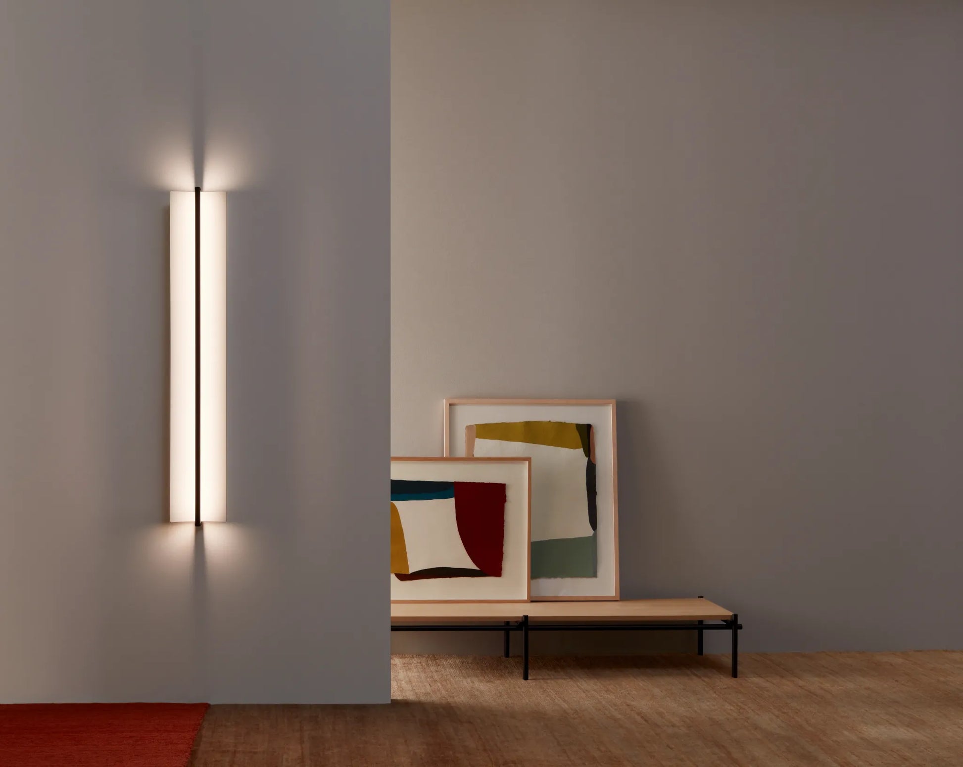 Cette applique murale se présente sous la forme d’une barrette ouverte où vient s’accrocher une plaque de métal incurvée faisant office de réflecteur. La barrette de métal noire est fixée au mur, l’ensemble dispensant un éclairage diffus évoquant une pluie de lumière.