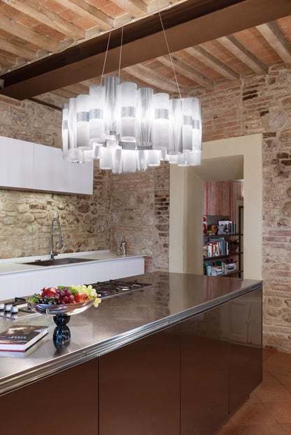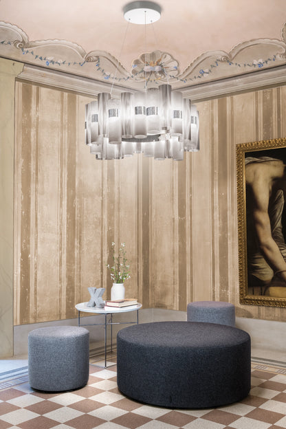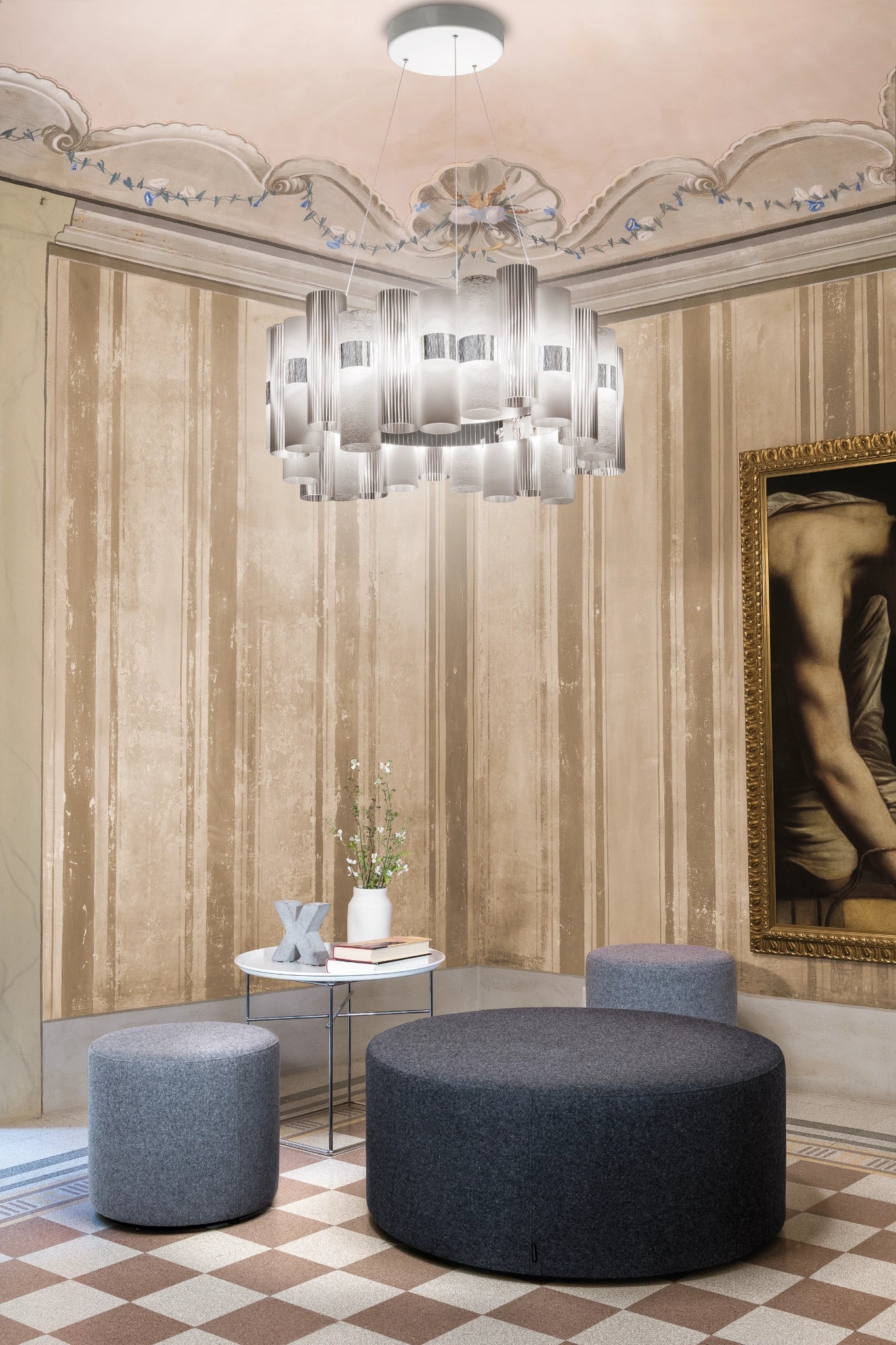 La série de cylindres de techno polymères se dispose autour d’un anneau central brillant et alterne des couleurs prismatiques, des effets de métallisation, des dentelles, des dégradés de couleurs contemporaines et des dessins géométriques. La collection comprend 2 dimensions différentes, ainsi qu’une version de luminaire somptueuse, prêtes à décorer des espaces intérieurs en mesure de les recevoir, et à créer des installations spectaculaires.