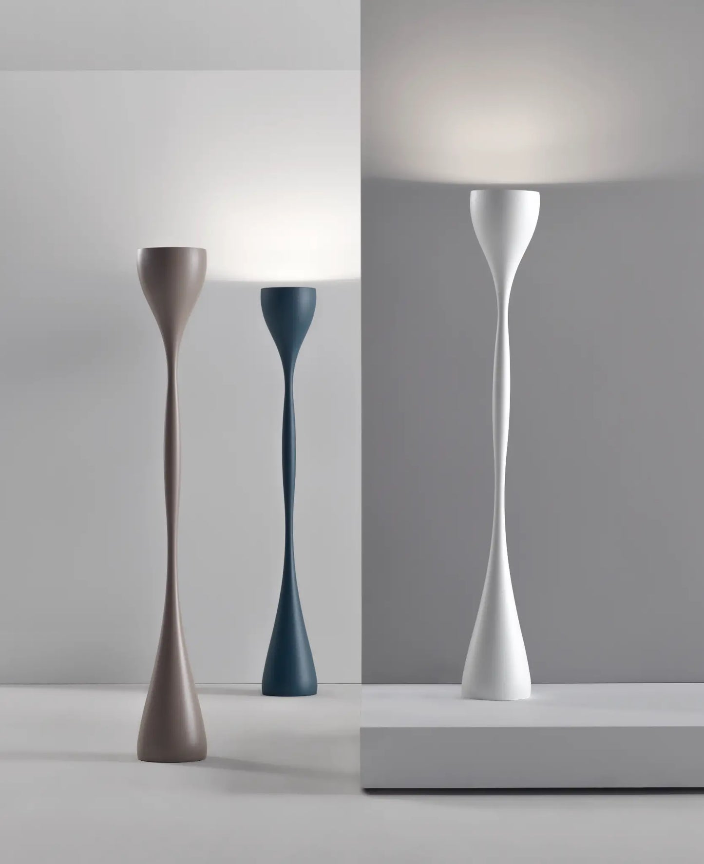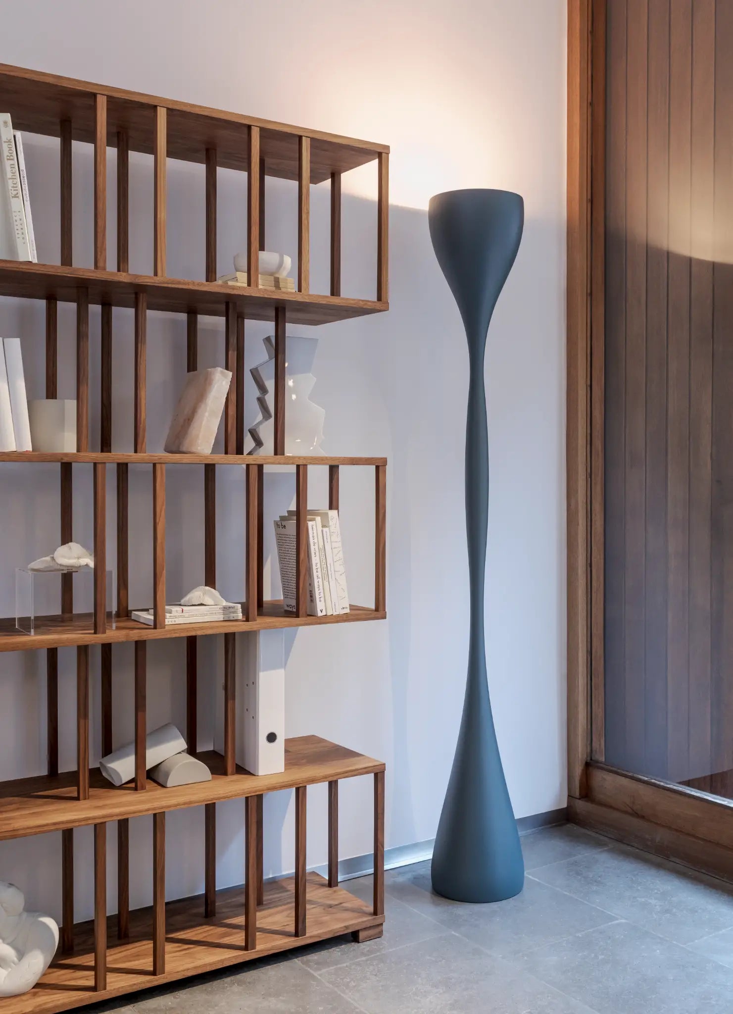 Le lampadaire Jazz, signé Diego Fortunato, combine élégance organique et lumière indirecte réfléchie, avec un variateur d’intensité intégré pour un éclairage adaptable.