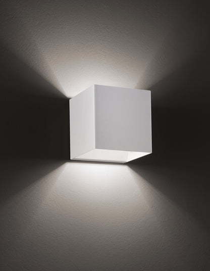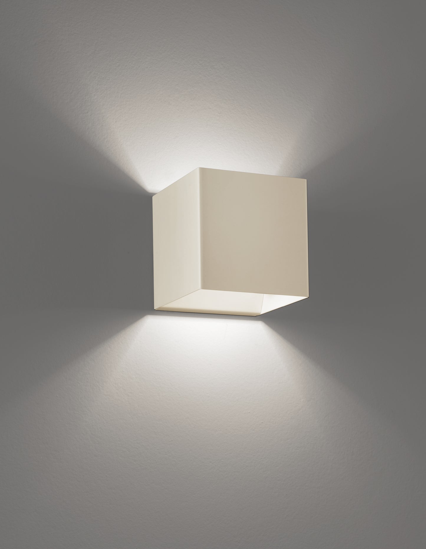 L'applique murale Laser se présente sous une forme cubique et compacte, qui lui confère un caractère polyvalent et architectural. Elle est fabriquée à partir d'une structure en acier peint disponible en trois finitions différentes. La source LED diffuse une lumière bidirectionnelle fonctionnelle et efficace, créant des jeux d'ombre et de lumière sur le mur.