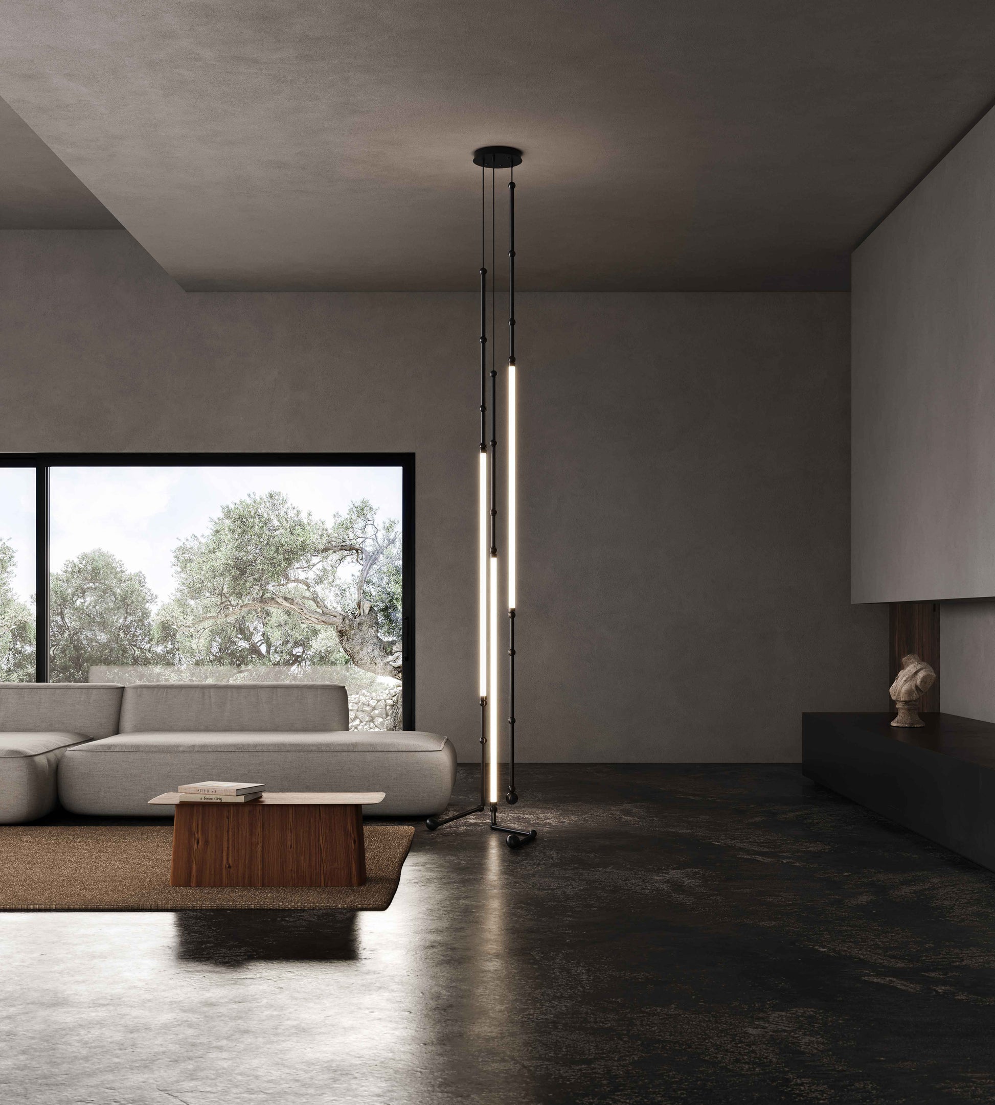 Léda, un collier de lumière composé de sphères et de cylindres en aluminium anodisé et avec un diffuseur flexible qui se prête à une variété d'agencements dans vos espaces intérieurs. Une petite fente en métal vous permet de changer la disposition et la forme de votre choix.