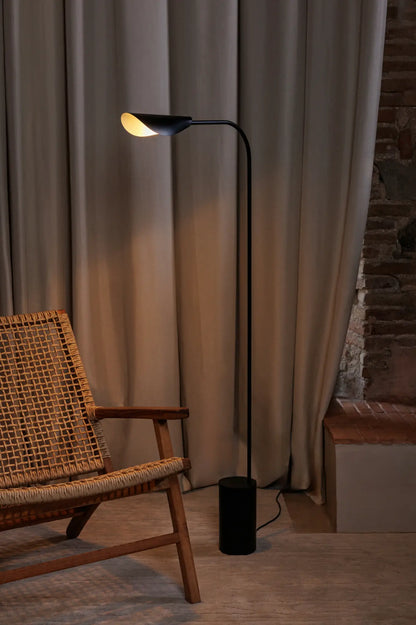 Lampadaire au design minimaliste japonais avec abat-jour orientable pour un éclairage direct ou indirect. Corps en acier noir mat.