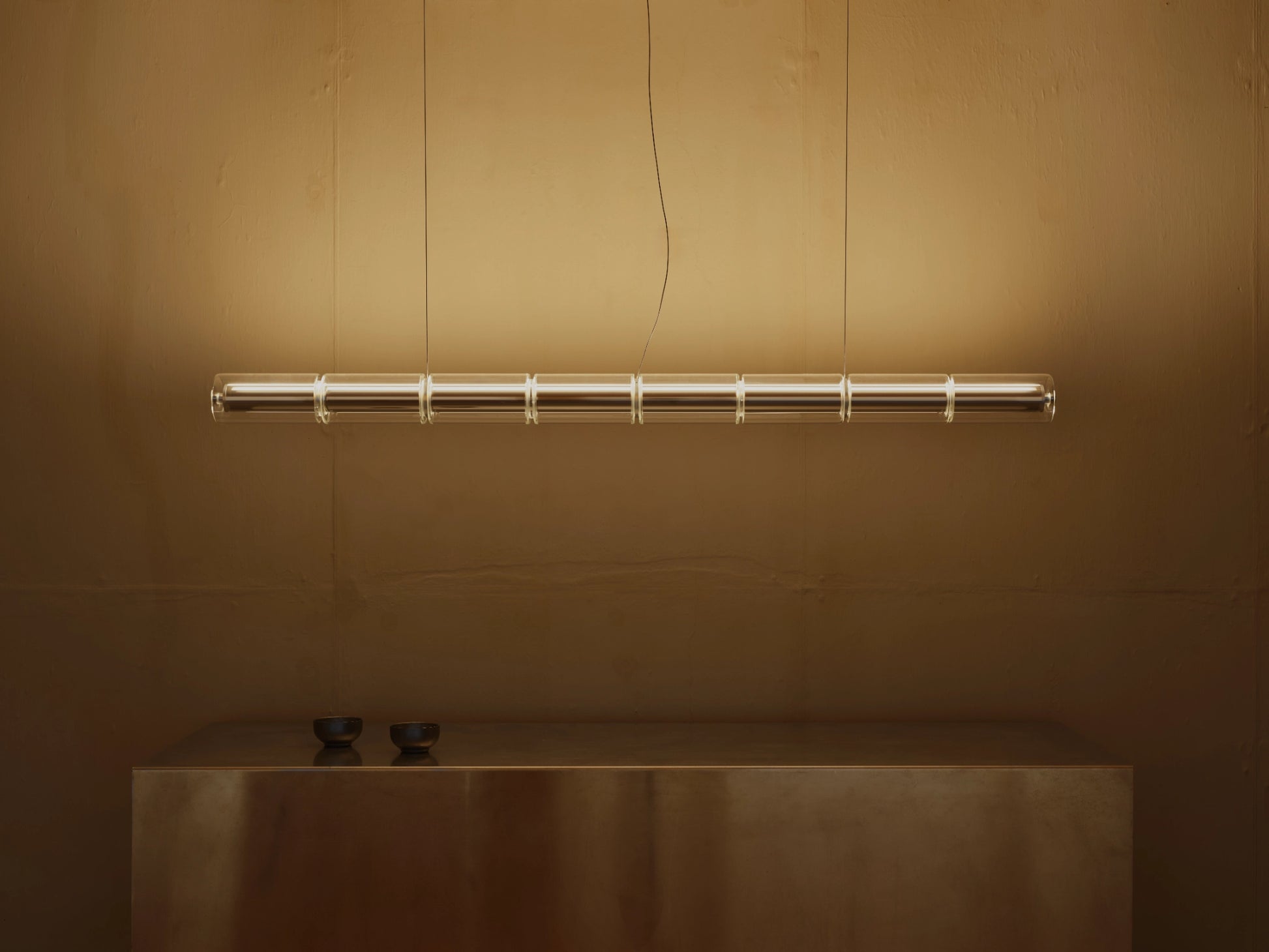 Luce Sferica S3 Cylindrique incarne la version la plus monumentale de cette série lumineuse. Longue de 2,5 mètres, elle impose une silhouette sculpturale dans n’importe quel espace.