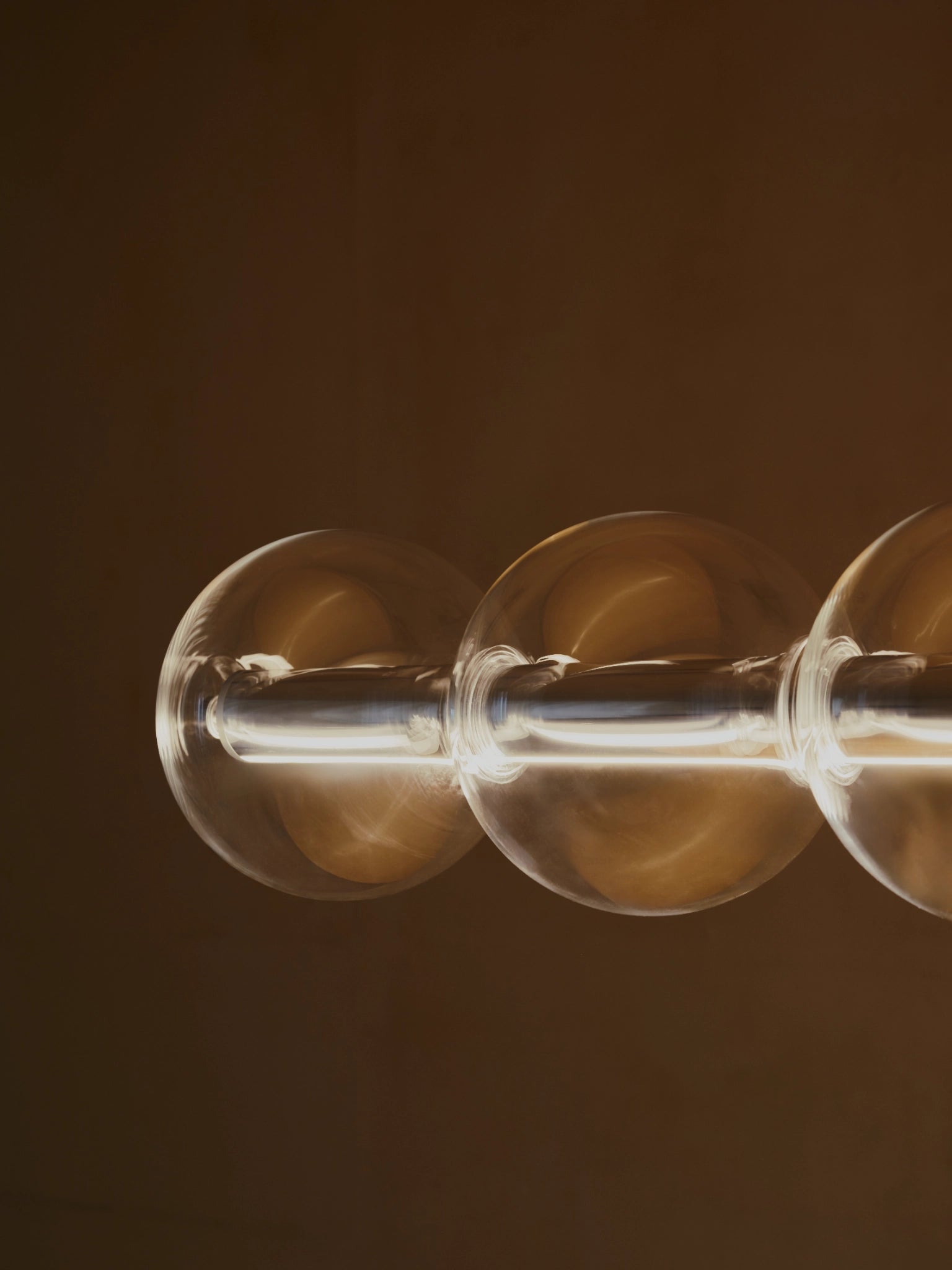 Le corps en aluminium poli, logeant deux bandes LED indépendantes, permet un contrôle tactile de la lumière vers le haut, vers le bas ou les deux. Chaque sphère est séparée par une entretoise, créant un jeu rythmique et fluide, entre tension géométrique et légèreté.
