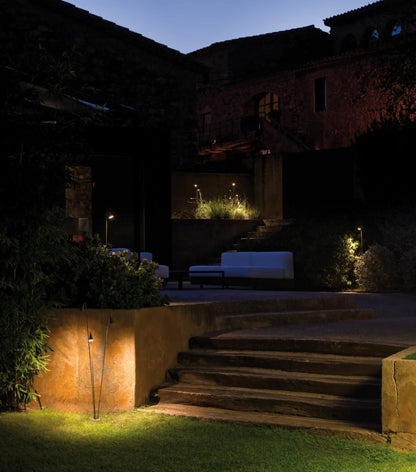 Brisa, une lampe encastrée LED orientable, illumine jardins et allées avec précision, disponible en kaki ou rouille mat pour une intégration naturelle.