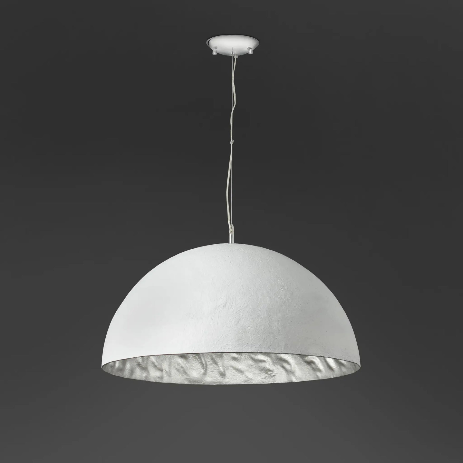 Suspension moderne en fibre de verre avec finition blanc mat et argent mat. Pour ampoule E27 (non incluse). Apporte une lumière ambiante élégante et contemporaine.