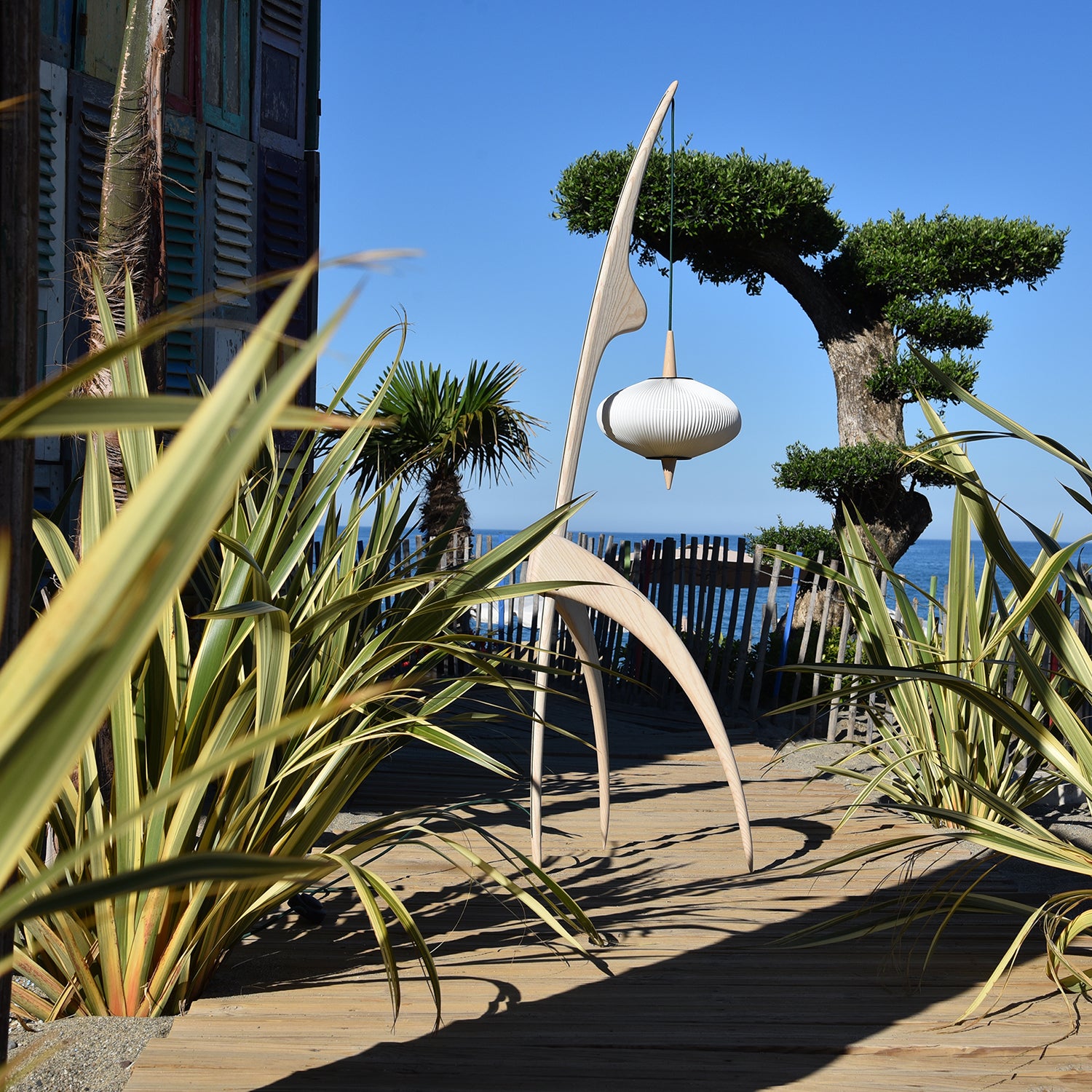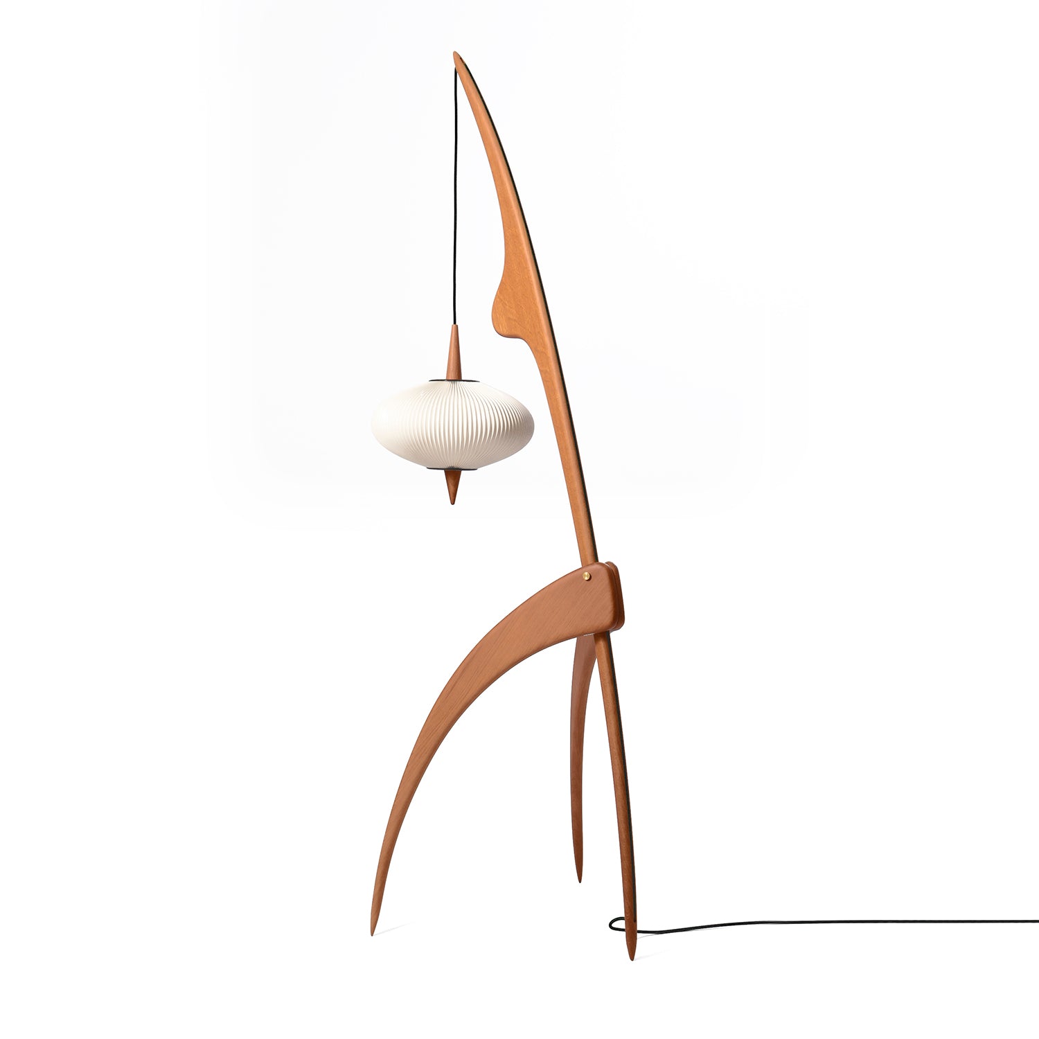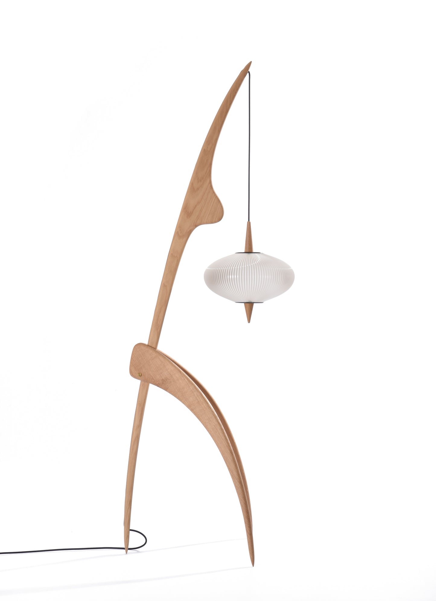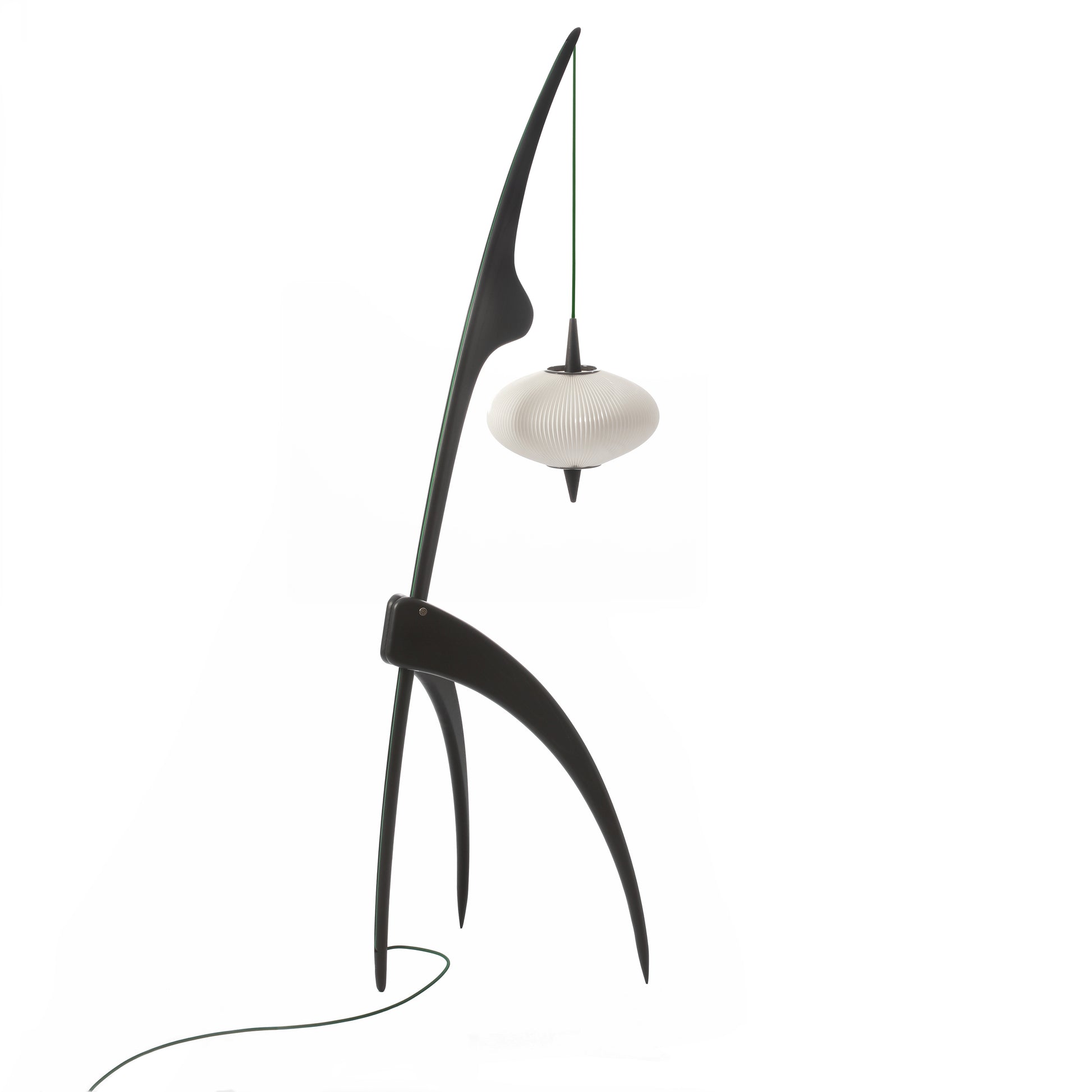 S’il y a un modèle qui représente à lui seul l’avant-gardisme de Rispal, c’est sans conteste la « Mante religieuse », un nom qui fut donné au fil du temps par les antiquaires et les décorateurs. En réalité, les produits Rispal ne portaient pas de noms mais des références. La « mante religieuse » est très souvent attribuée à un certain Jean Rispal. Ceci n’est que pure fiction, les luminaires Rispal étant dessinés par un bureau de style intégré au sein de l’entreprise et dirigé par François Rispal (le fils du fondateur de l’entreprise Rispal). Créé en 1950, le luminaire N° 14.950 fut rapidement baptisé la “mante religieuse” en raison de sa ressemblance avec l’insecte. Dessiné par le bureau de style de l’ entreprise RISPAL, elle ne fit cependant sa première apparition qu’en 1952 à Paris, lors du 36 ème Salon des Artistes décorateurs. L’ acétate de cellulose est un « bio-plastique » fabriqué a partir de fibre de coton ou de pulpe de bois. Ce matériau renouvelable est bio-dégradable et n’utilise pas de pétrole pour sa fabrication. iIl est le même que celui utilisé à l’époque. La technique utilisée pour la mise en forme de cet abat-jour est un procédé unique developpé par la Maison Rispal dans les années cinquante.