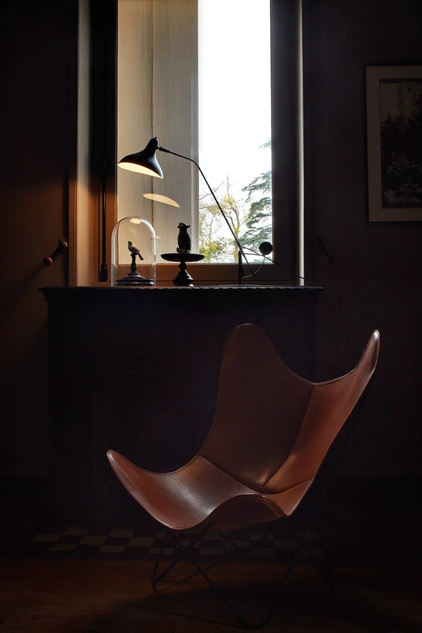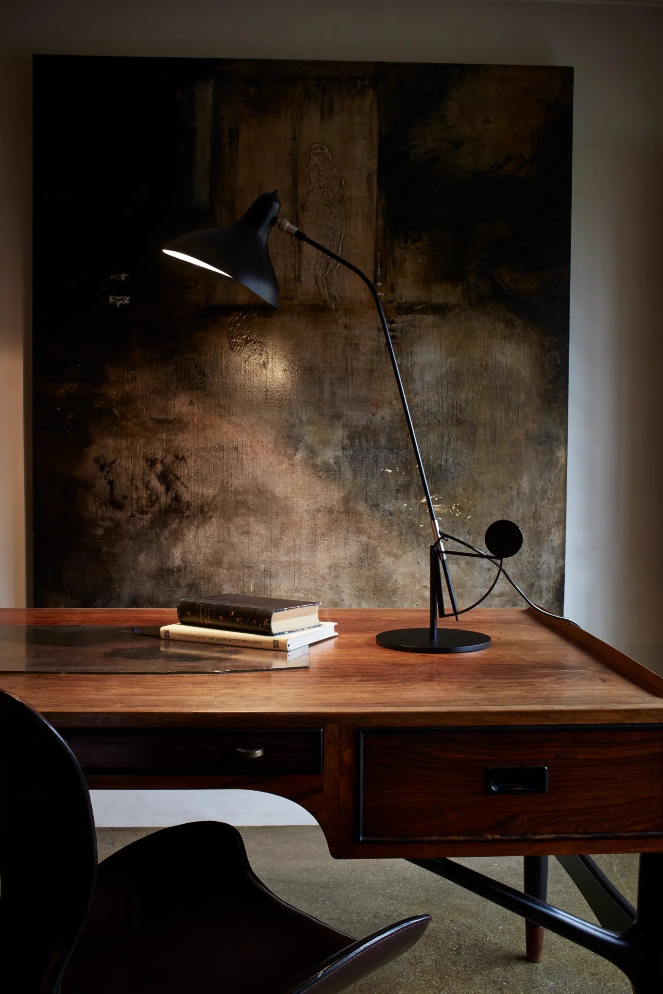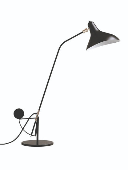 Grand admirateur d’Alexander Calder, Bernard Schottlander crée en 1951 une série de luminaires du nom de MANTIS. Le mouvement est la source d’inspiration de tout le travail de Schottlander : artiste, ingénieur-bricoleur, il met au point un système de pivot-contrepoids astucieux, et utilise des joncs de métal souples et résistants. L’abat jour, projeté comme un acrobate en l’air, reste unique. La poésie de l’objet invite au rêve. L’élégance sur un fil...