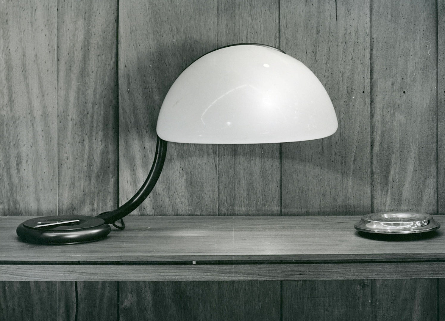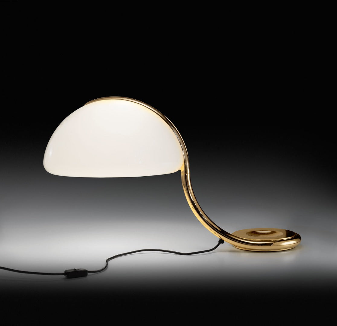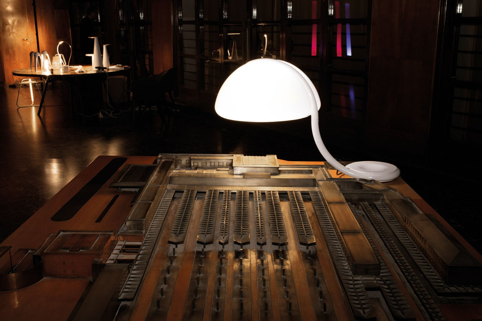 Objet culte du design, la lampe Serpente a été créée par Elio Martinelli en 1968. Cette lampe de table ou de bureau à lumière diffuse est orientable grâce à son bras articulé. Le diffuseur est en méthacrylate blanc opale et la structure en métal laqué blanc. Mythique, Serpente est exposée dans les plus grands musées du monde entier.