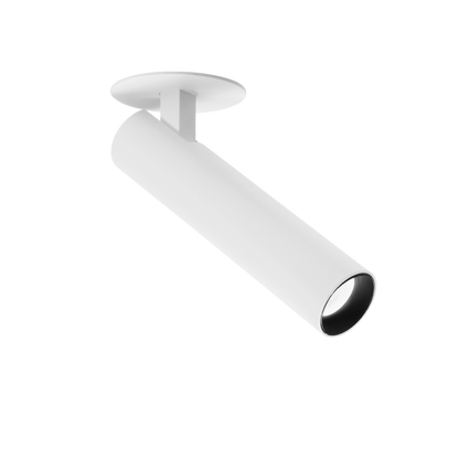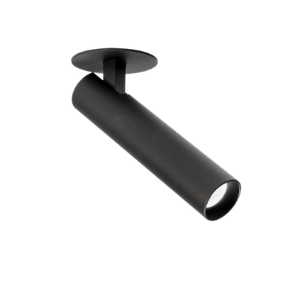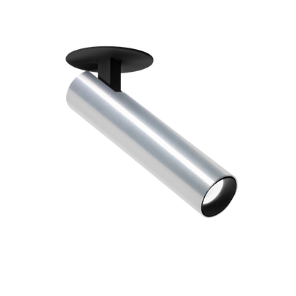 Spot demi-encastré en aluminium mat, technologie COB, tête rotative à 350° et orientable à 90°. Montage sans outil, profondeur d’encastrement 60 mm. IP20, Classe 3, driver non inclus, source remplaçable par un professionnel.