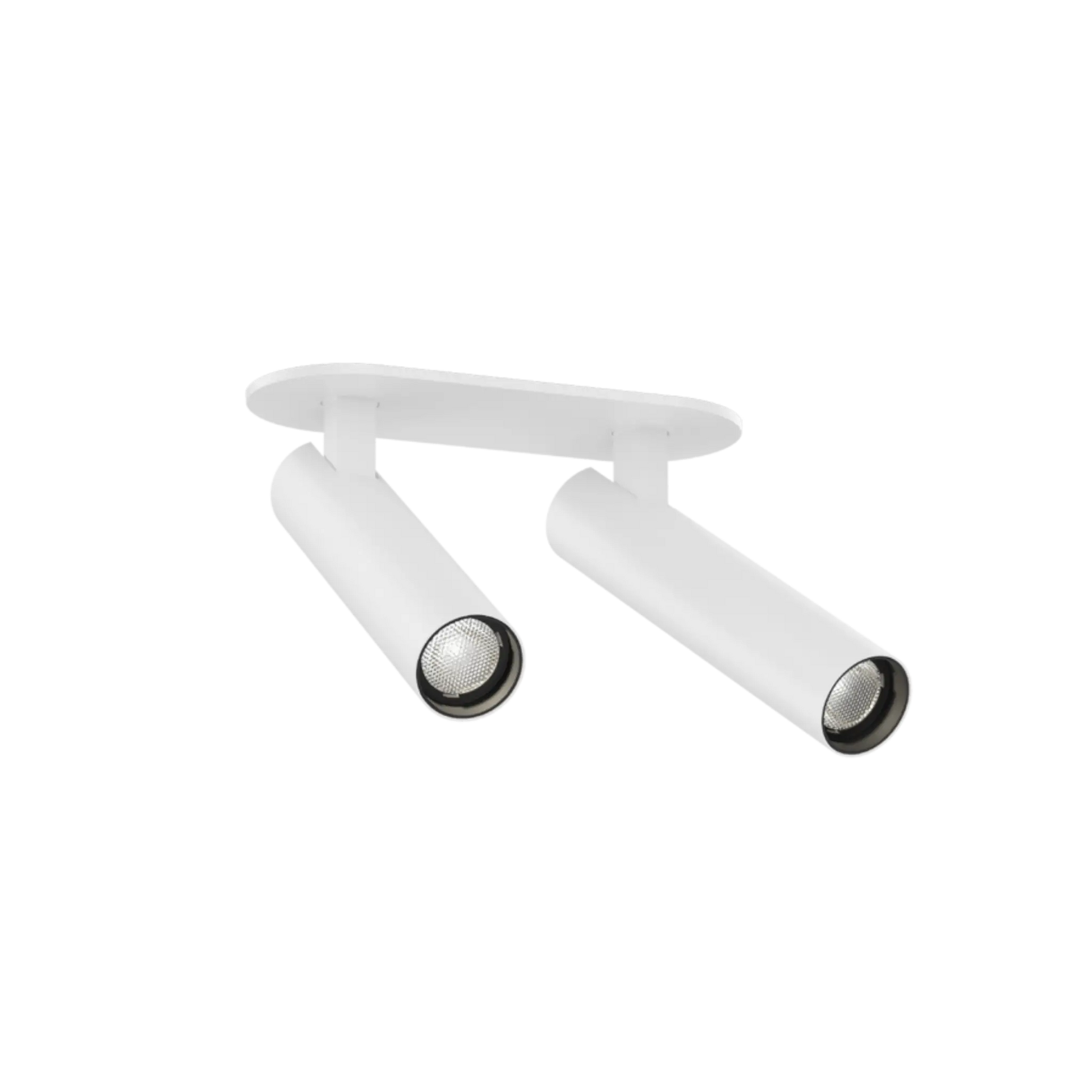 Plafonnier encastré avec 2 spots en aluminium mat, technologie COB, lumière 2700 K, CRI ≥ 90, angle 30°. Spots rotatifs à 350° et orientables à 90°. Installation sans outil, profondeur d’encastrement 60 mm. IP20, Classe 3, driver non inclus, source remplaçable par un professionnel.