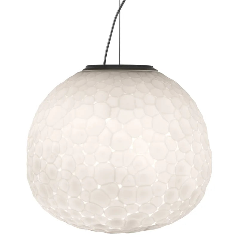 METEORITE « naît de la recherche d’une nouvelle sensibilité, un nouveau langage expressif pour les lampes en verre soufflé. Le point de départ était notre envie d’utiliser le verre vénitien «battu», pour un effet « broyé » et pour le charme de l’impression d’«inachevé» que donne un tel procédé au verre. Artemide a conçu pour cela une technique de production bien spécifique, permettant d’obtenir une profondeur impressionnante de la lumière de cet objet éclairant et faire que cette beauté soit accessible ou – dirons-nous – démocratisée.» Pio &Tito Toso Cette famille de luminaires se décline en quatre types : lampe de table, suspension, applique et plafonnier. Chaque luminaire METEORITE est composé d’une double couche de verre pour le diffuseur, obtenue grâce aux techniques artisanales de soufflage dans un moule suivi d’un passage à l’acide puis sablage pour ce rendu d’un verre unique extrêmement diffusant.