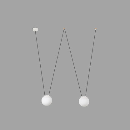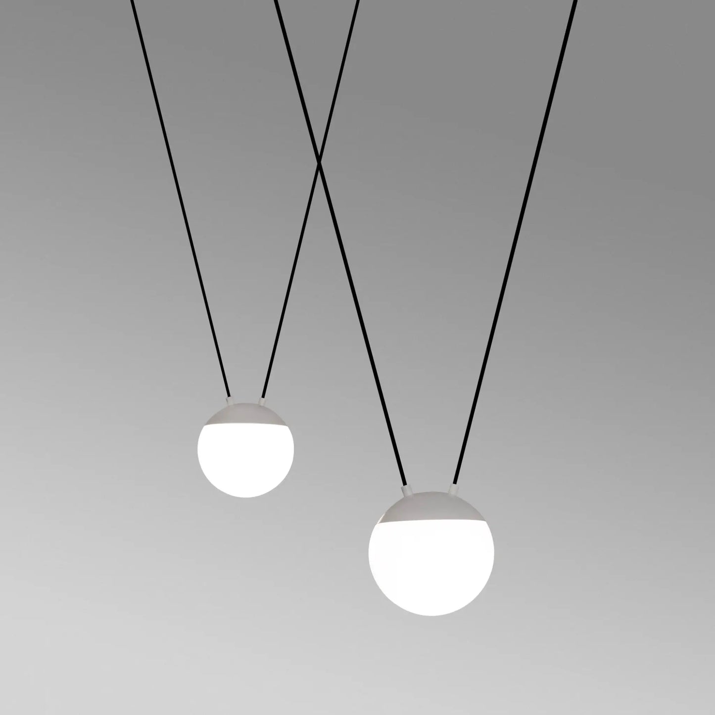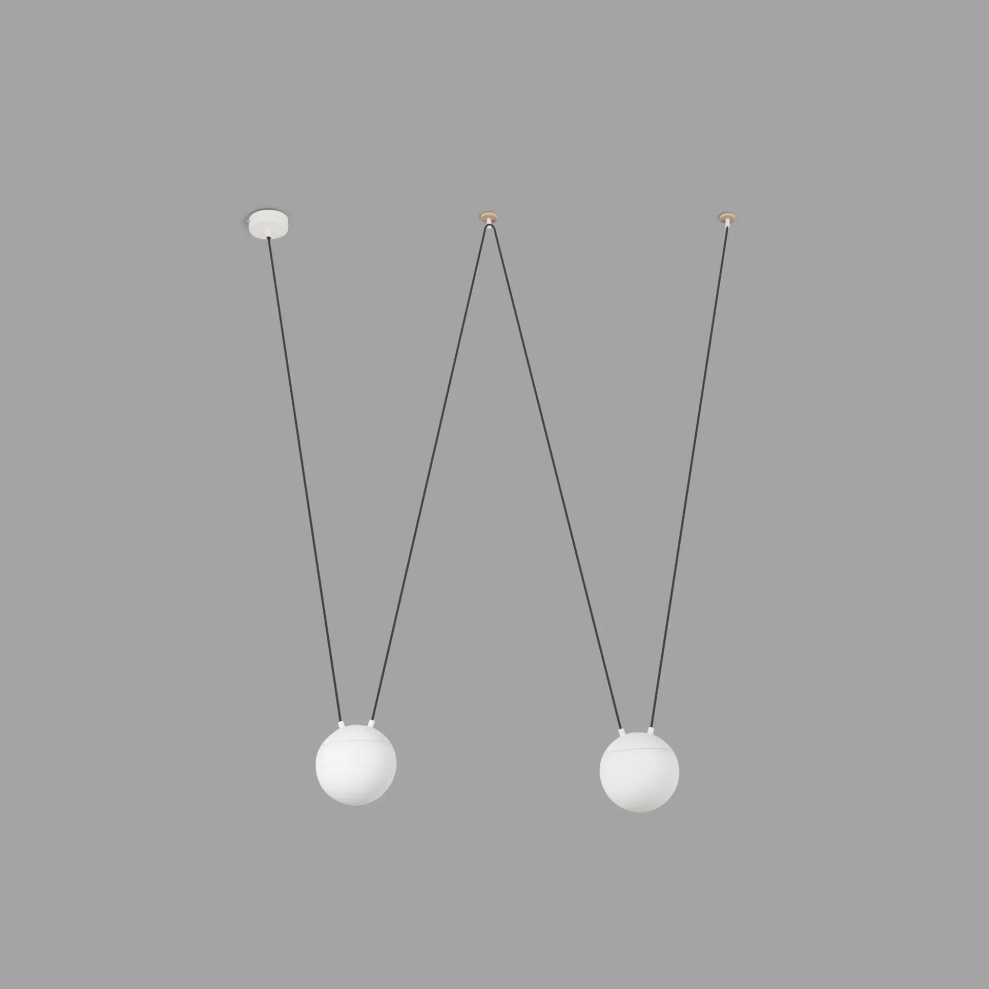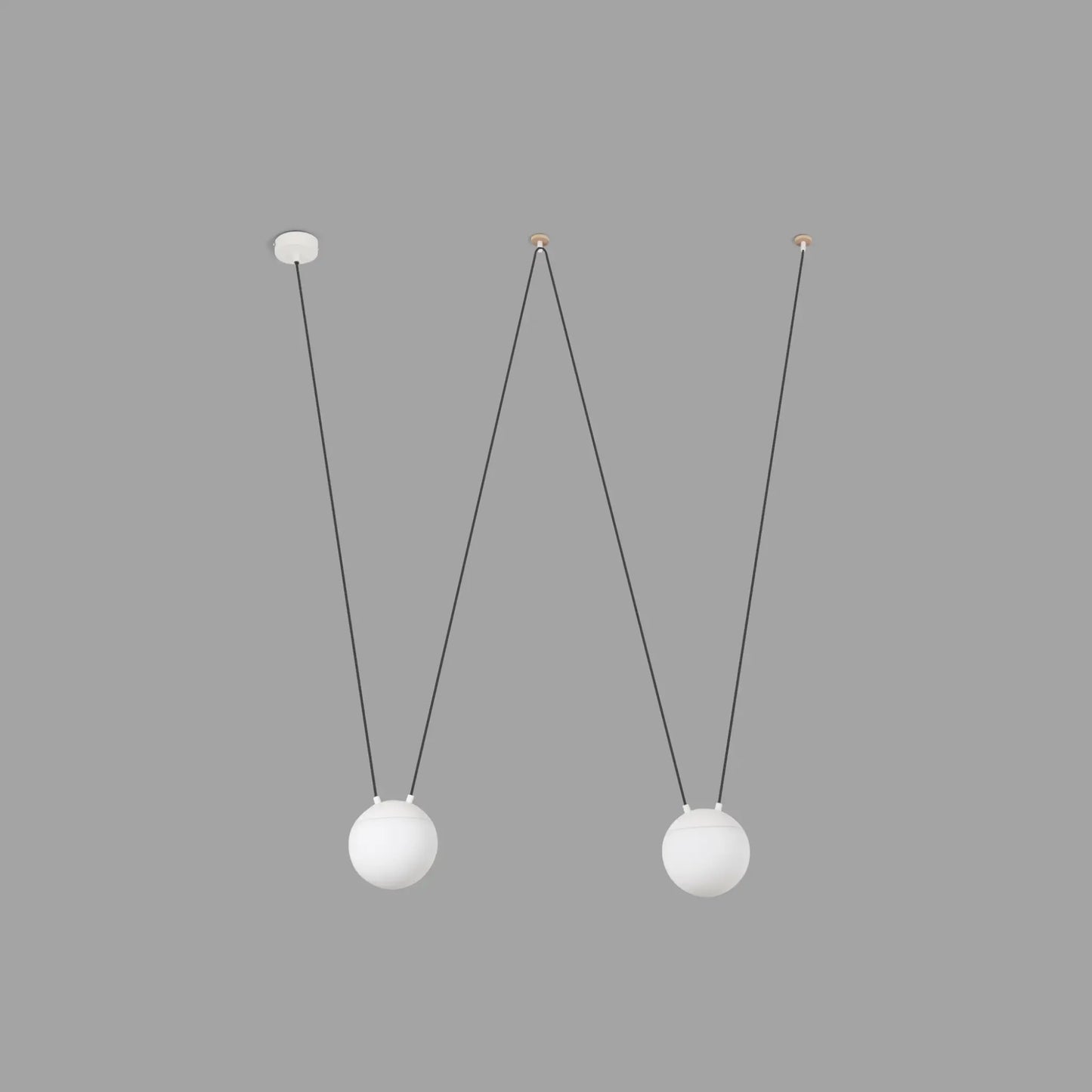 Cette suspension à deux lumières, créée par le studio Nahtrang, associe une structure en métal blanc mat, un élément en bois naturel et un diffuseur en verre opale. Elle émet une lumière ambiante douce qui crée une atmosphère chaleureuse et accueillante dans votre intérieur.