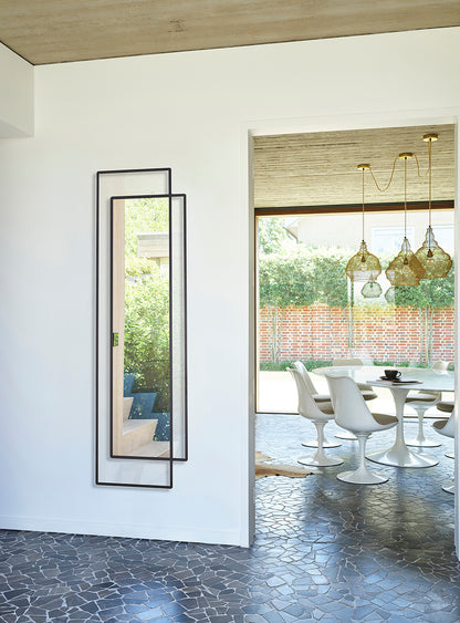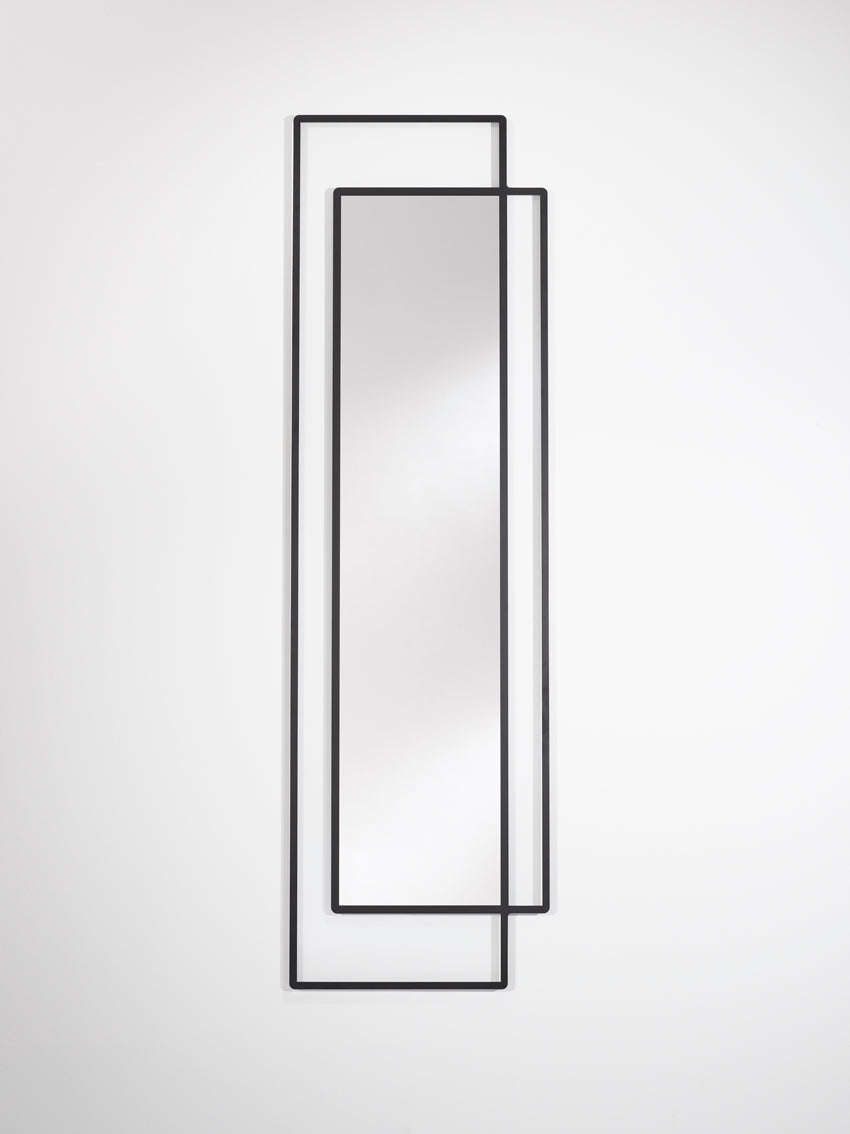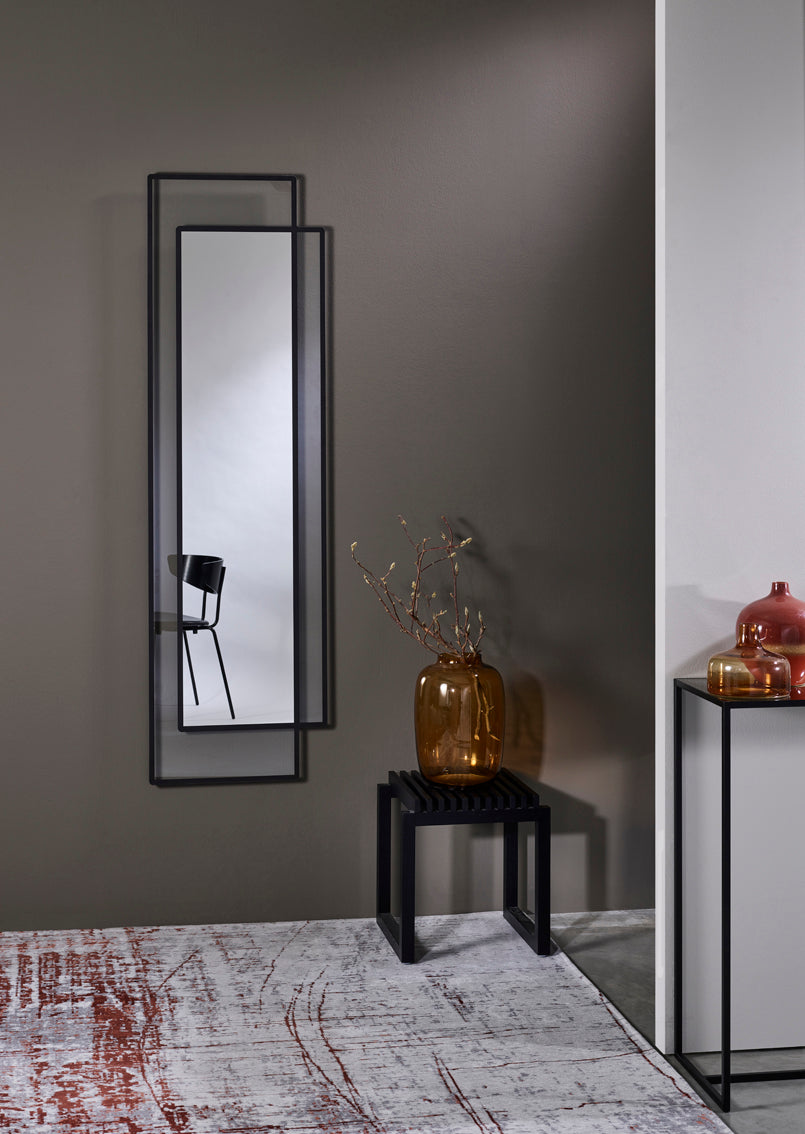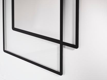 Le miroir Bordo est un magnifique miroir au design épuré. L'intersection de deux surfaces définit clairement la partie miroitée. En jouant avec les parties transparentes et noires, le miroir semble avoir un cadre en métal. La technologie vous induit en erreur: la couleur du mur est visible à travers les zones transparentes du dessin, créant une illusion. Où est exactement le bord? Bordo est une conception trompeusement simple, un miroir sans fioritures, et pourtant il est élégant et fort. Il peut être suspendu verticalement ou horizontalement.