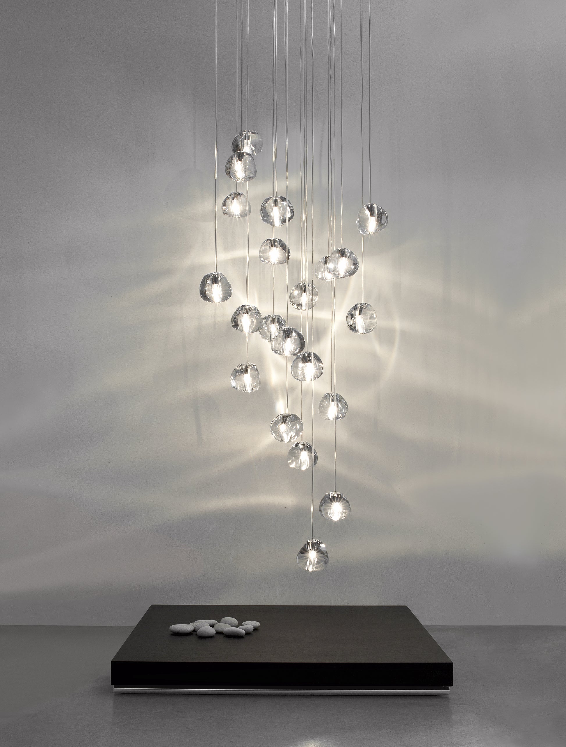 Inspirée par la lumière tranquille et envoûtante des reflets créés par l'eau, Mizu est unique. Comme des gouttelettes d'eau, pas deux Mizu se ressemblent, chaque forme de verre est unique et faite méticuleusement à la main. En utilisant uniquement le verre le plus clair, Mizu reproduit parfaitement la réfraction de la lumière de l'eau, projetant des motifs étonnants dans la pièce. Également disponible en feuille d'or et argent.
