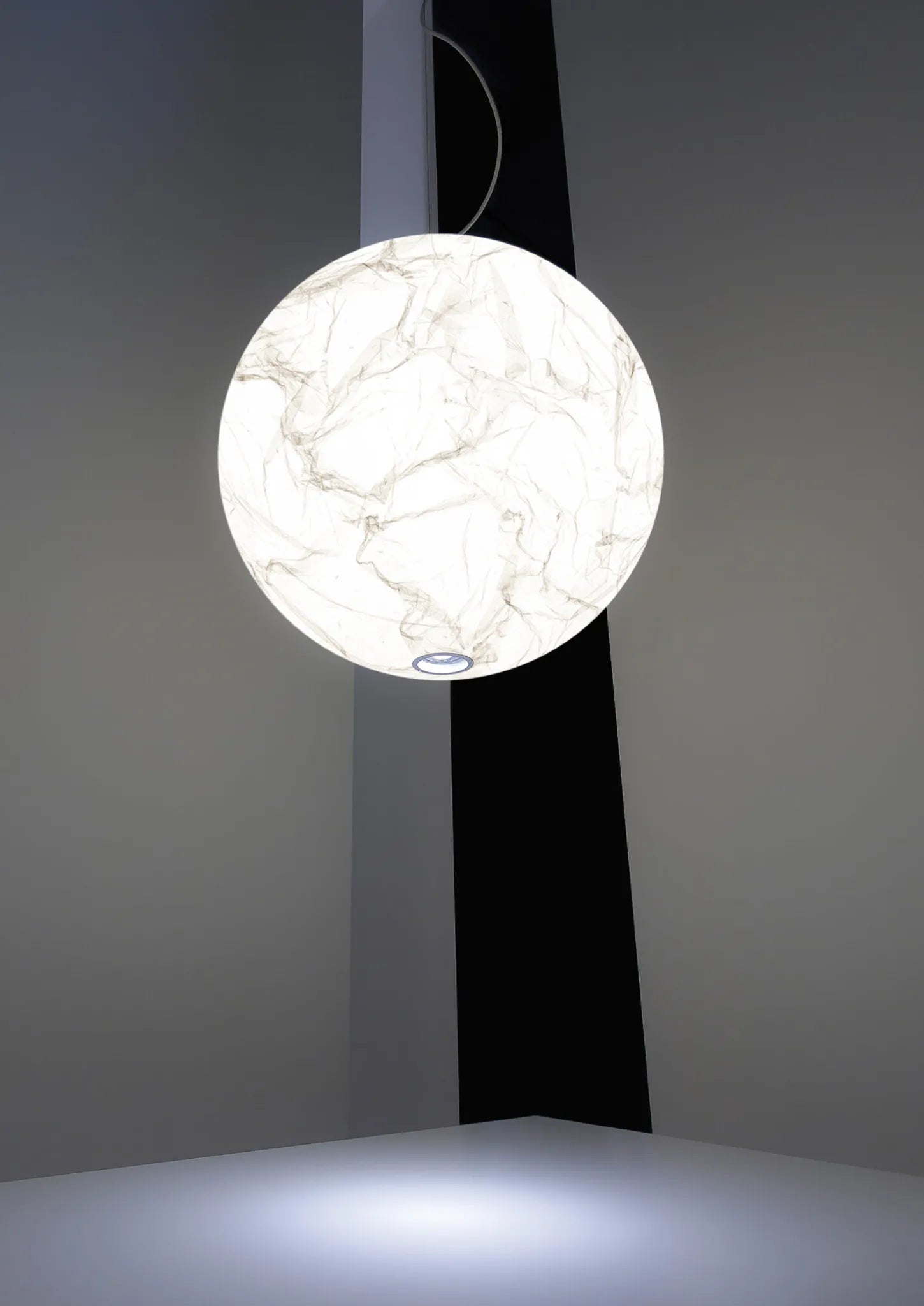La suspension en papier japonais, qui rappelle la pleine lune par sa couleur, sa forme et sa matérialité, font de cette lampe de Davide Groppi le véritable protagoniste de l'environnement tout en respectant le style et la tradition japonaise. Tout comme la lune donne à la nuit une atmosphère romantique, Davide Groppi a voulu proposer à nouveau une lumière capable de rendre la même émotion aussi à l'intérieur. La forme sphérique et la porosité du papier japonais avec ses différentes nuances de couleur sont mises en valeur par l’ampoule interne.