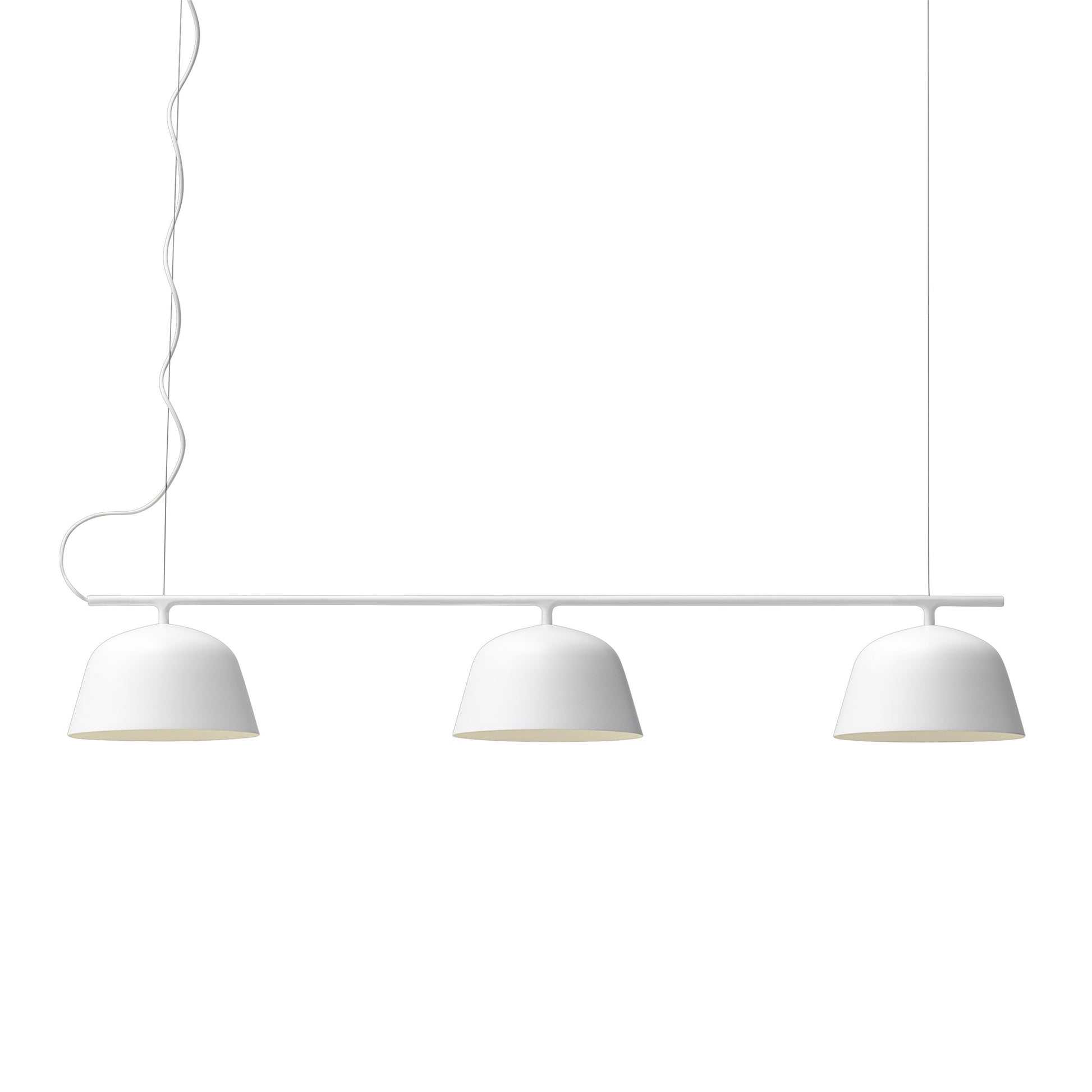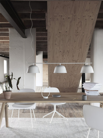 Créée par Taf Studio, Ambit est une collection de suspensions aux formes épurées et séduisantes avec des proportions généreuses. La version Ambit Rail est dotée de trois diffuseurs qui permettent une lumière efficace en amenant une touche à la fois minimaliste et élégante. Muuto édite ce luminaire en utilisant la tradition ancienne des braseros : l'aluminium est tourné à la presse, poli et peint à la main. Mariage entre tradition et modernité, Ambit Rail est parfaite au-dessus de la table de la salle à manger ou pour éclairer un comptoir de cuisine.