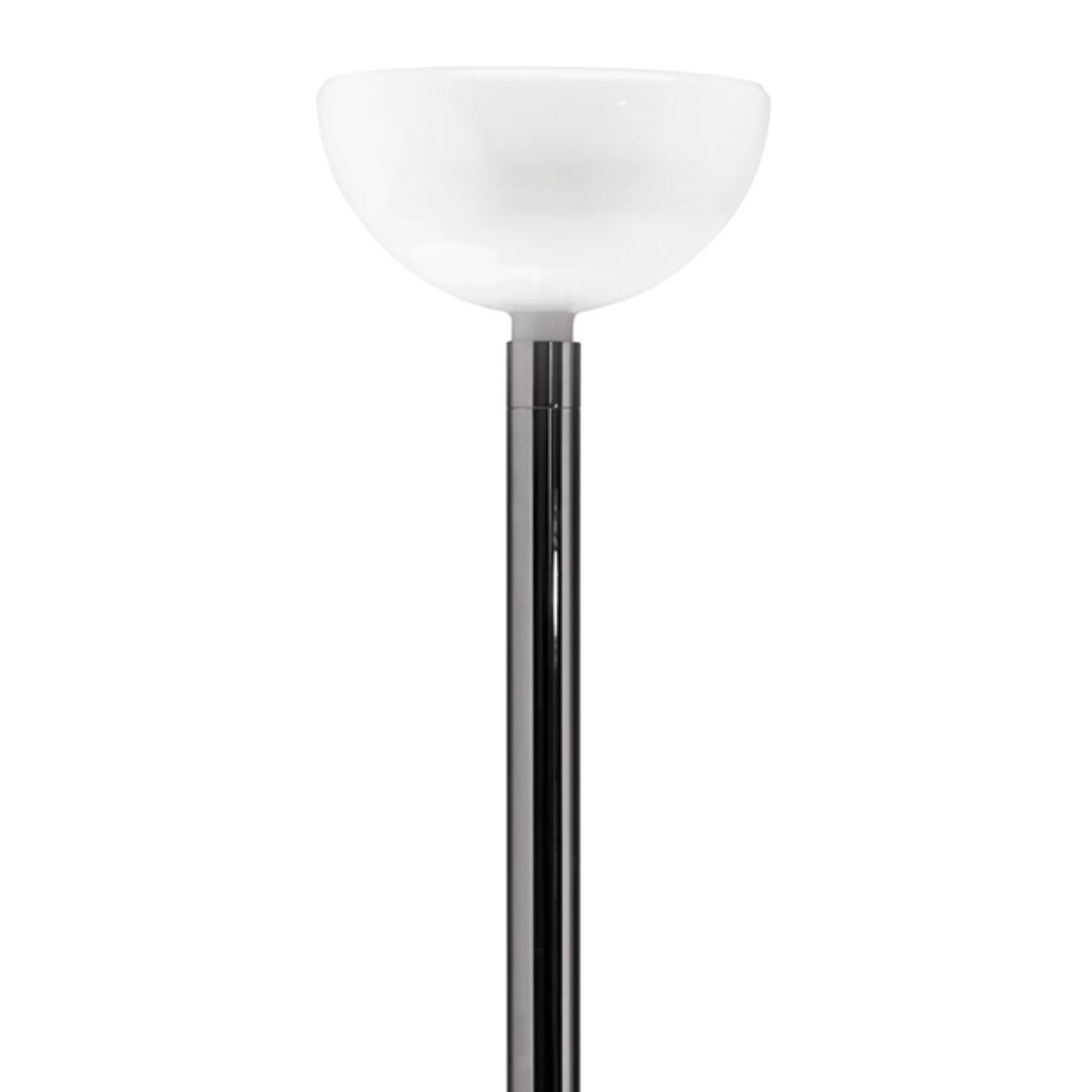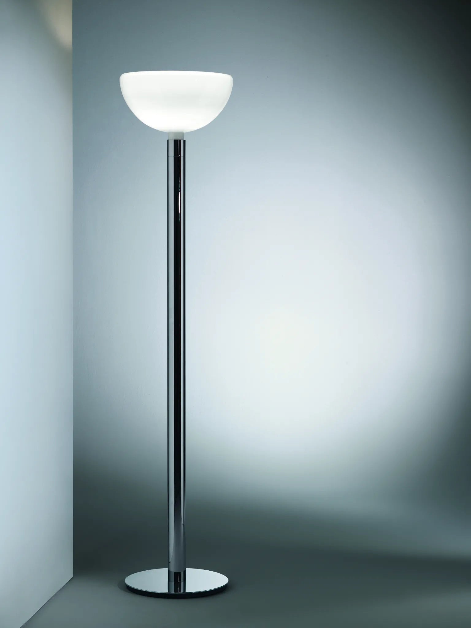 Lampadaire avec structure chromée. Diffuseur en verre blanc opalin.
