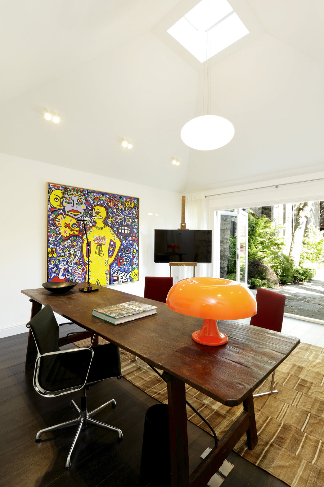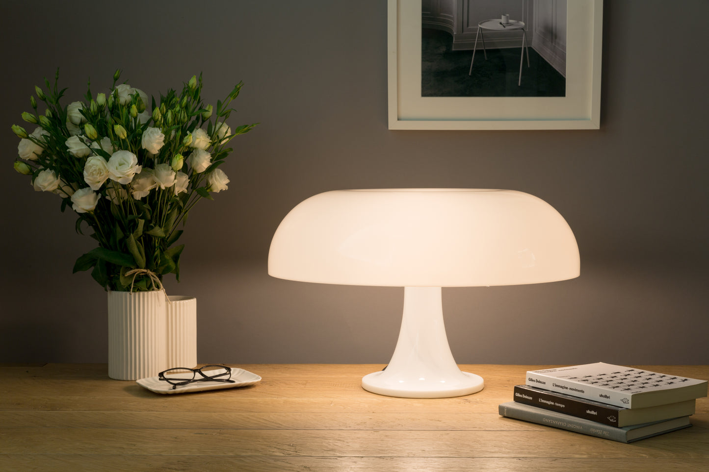 Dessinée par Giancarlo Mattioli en 1967, la lampe Nesso est devenue une véritable icône du design des années 70. Dès sa sortie, cette lampe Artemide connait un vif succès et remporte le 1er prix du Concours Studio Artemide /Domus à Milan. ‘’Pop’’ par essence, la lampe Nesso se caractérise par la grande taille de son abat-jour (Ø 54 cm) et par sa forme arrondie qui évoque un champignon. Elle se compose d’une structure monobloc en résine ABS injectée dans des moules en chrome. La conception de cette lampe évite à la lumière des ampoules d’éblouir. Elle est exposée dans de nombreux musées du monde entier, dont le célèbre MoMA de New York.