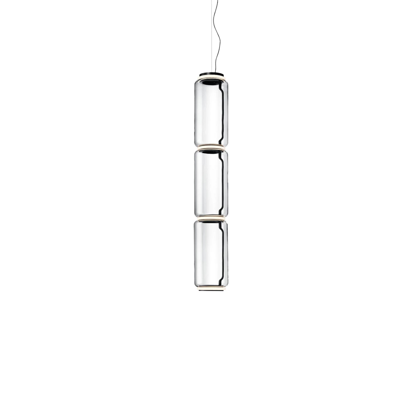 La suspension Noctambule 3 High Cylinder Suspensions LED par Flos est composée de 3 cylindres successifs de 45cm de hauteur. La collection Noctambule permet des configurations de plusieurs éléments en verre connectés entre eux. La longueur du câble d'alimentation est de 4 mètres, ce qui permet d'avoir une suspension allant jusqu'à 3,2 mètres de haut (magnifique dans une cage d'escalier !).