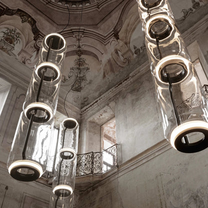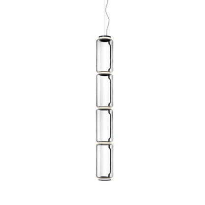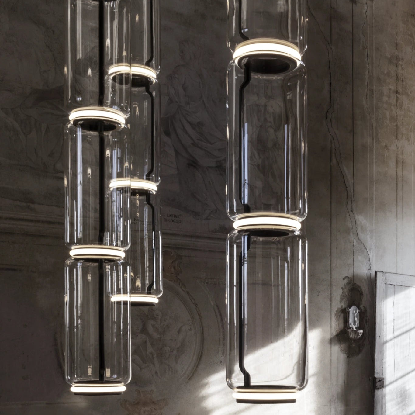 Cette superbe suspension de la collection Noctambule par Flos est composée de 4 cylindres successifs de 45cm de hauteur chacun. Cette collection permet des configurations de plusieurs éléments en verre connectés entre eux. La longueur du câble d'alimentation est de 4 mètres, permettant d'avoir une suspension allant jusqu'à 3,2 mètres de haut (magnifique dans une cage d'escalier !).