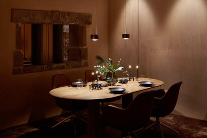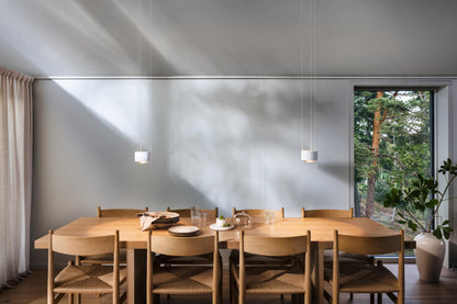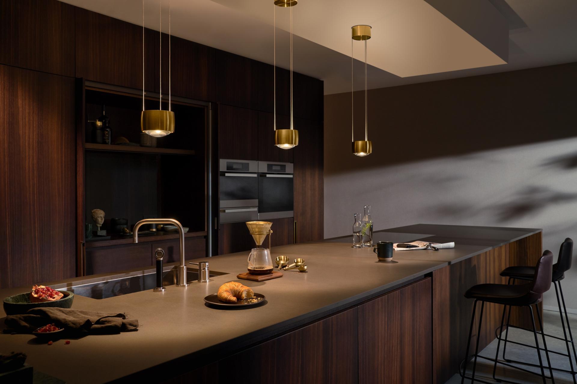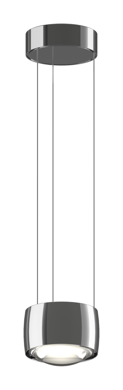 Sento sospeso est une gamme de suspensions modulables : une fois installée, la hauteur peut être variée de 50 à 200cm. Elle éclaire de façon diffuse vers le plafond et de façon plus ponctuelle vers le bas. Ces deux éclairages peuvent fonctionner individuellement. Enfin, une simple position statique de la main sous ou sur la suspension fera varier l'intensité. Et un movement latéral éteindra ou allumera la partie souhaitée. Magique !