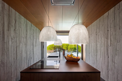 Onn est une collection de luminaires en maille d'acier inoxydable peint. Ils évoquent le monde marin: coquillages, algues et coraux émergent avec une grande force, pleins de dynamisme et de vitalité. Idéal pour les murs, les tables et les plafonds, ils permettent des compositions intéressantes par leurs formes inhabituelles. Cette suspension existe en blanc, beige, gris ou taupe : nous consulter.