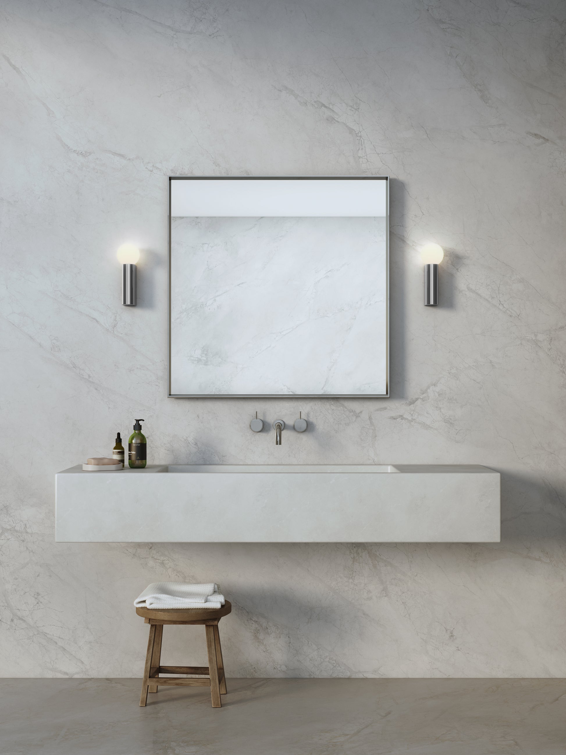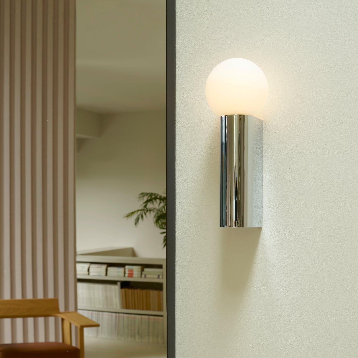 Inspirée du minimalisme des années 1980, cette applique murale de salle d'eau s'utilise à côté des miroirs. Son abat-jour remplaçable en verre opale diffuse une lumière d'ambiance chaleureuse. Le support, en noir mat ou chrome poli, est moulé sous pression. Indice IP44 pour une utilisation sûre dans les zones humides.