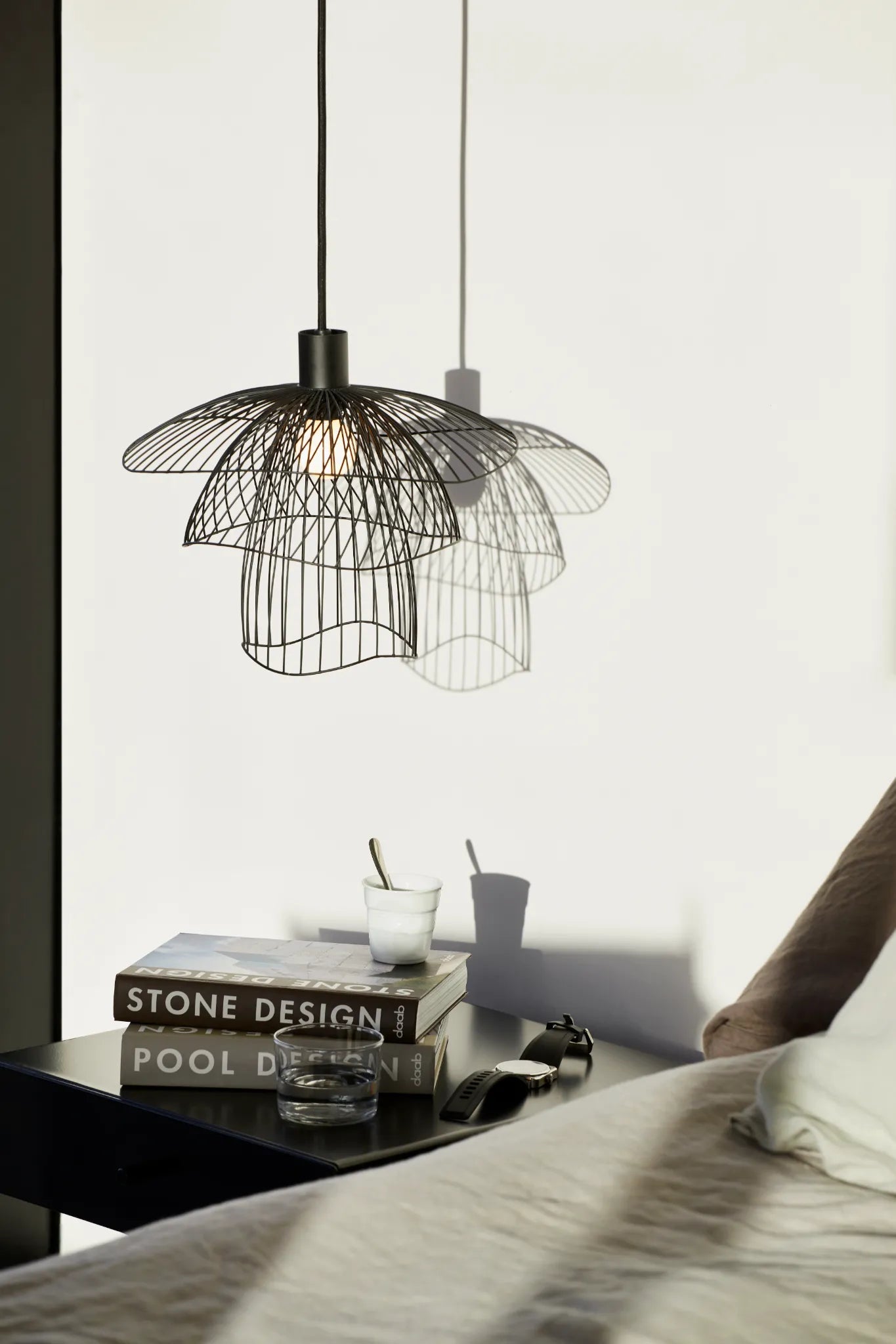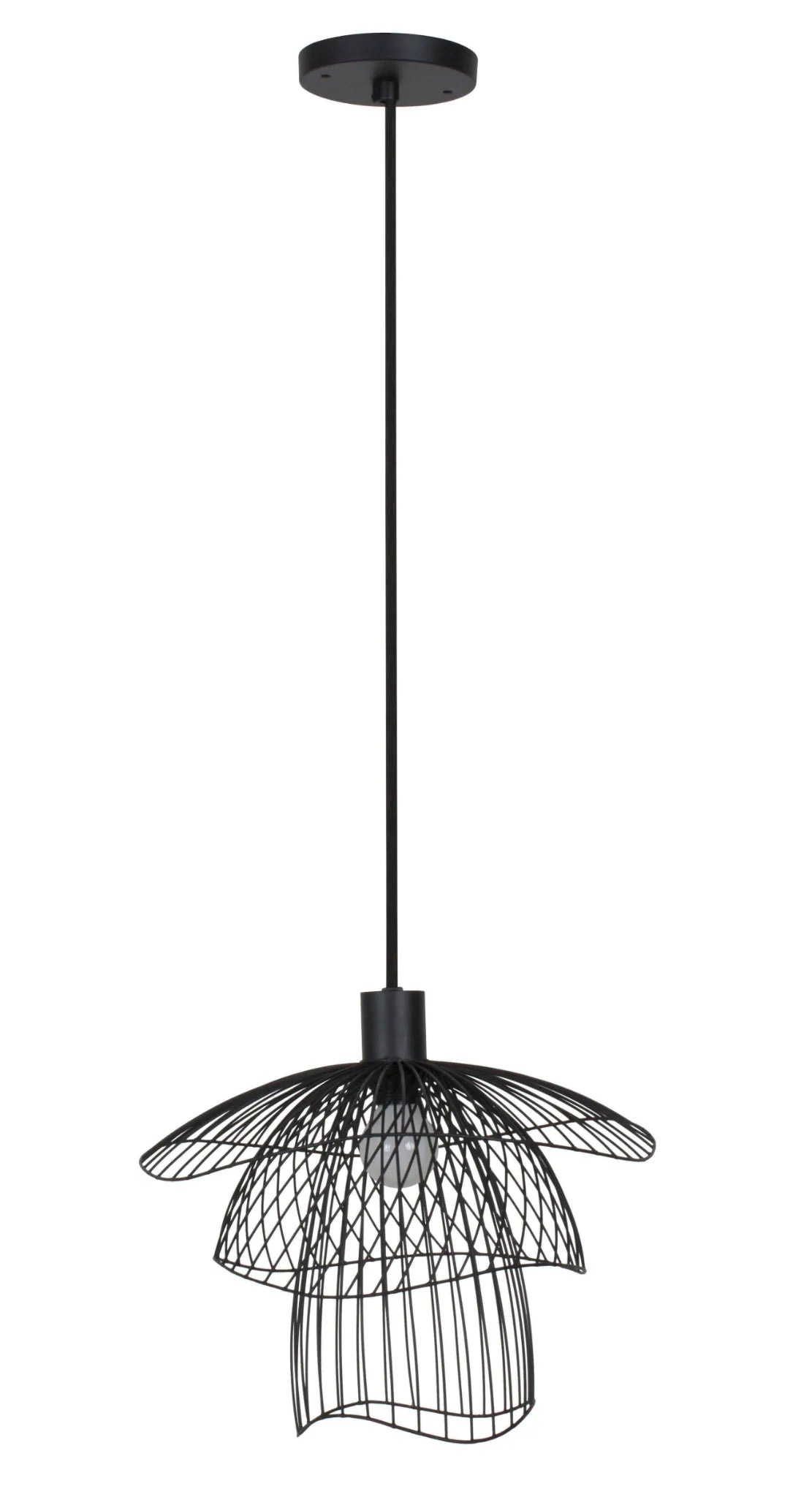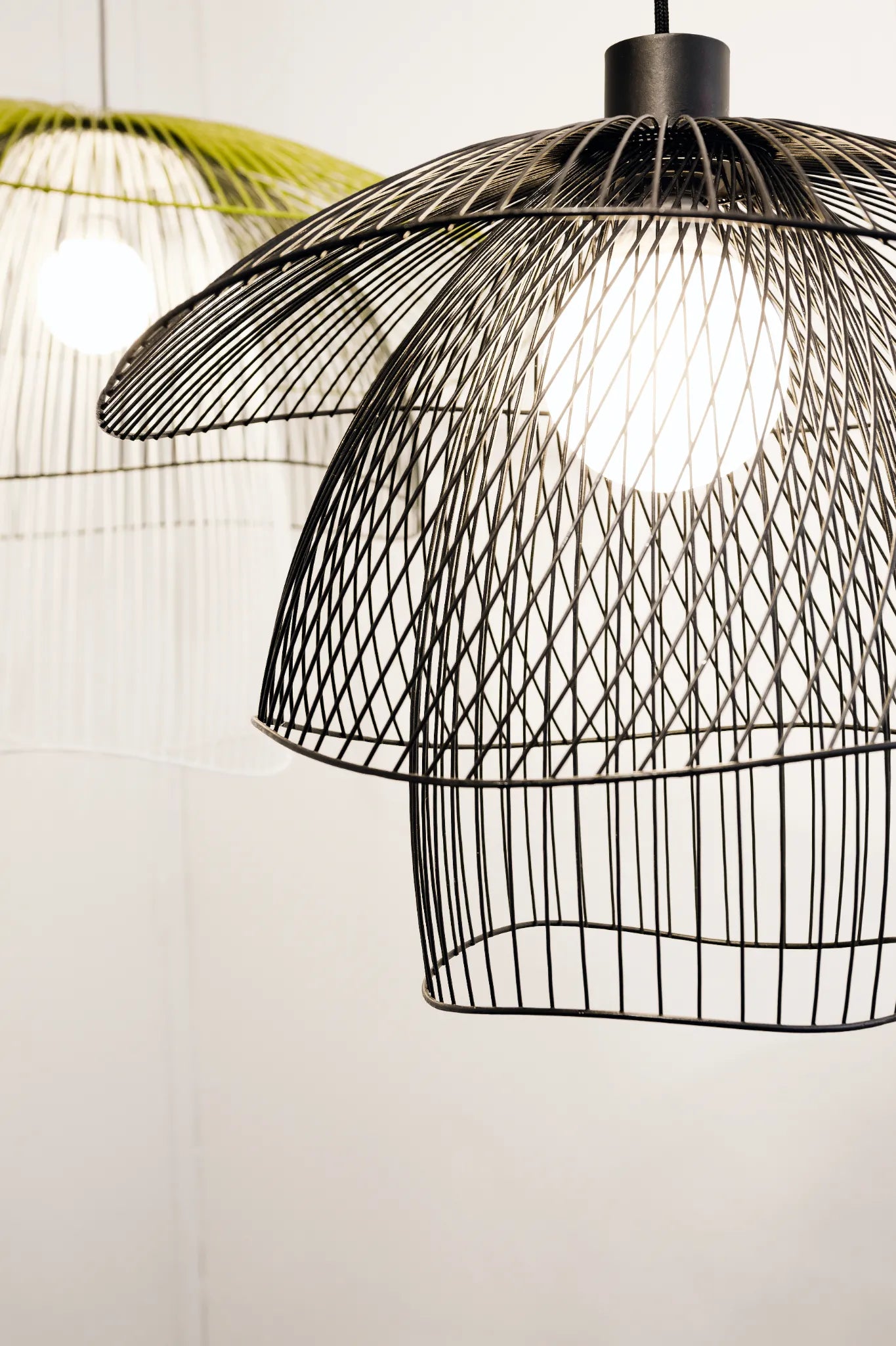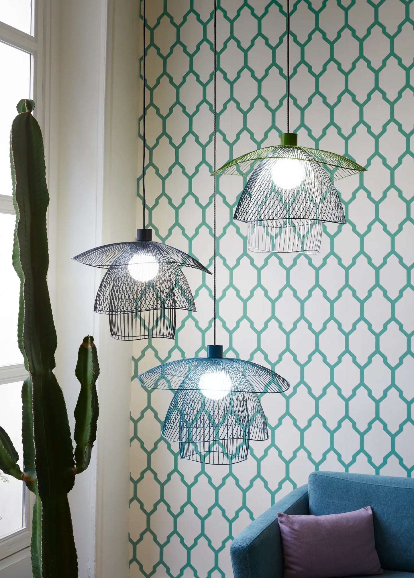 Imaginée par la designer française Elise Fouin, cette superbe suspension affiche un design poétique et une silhouette légère. La lumière filtrant à travers les multiples fils de métal offre un bel éclairage, tout en jeu d’ombres et de lumières. La structure se compose de trois coupoles de différentes tailles superposées. Les volumes aériens s’enchevêtrent et créent de jolies formes géométriques.