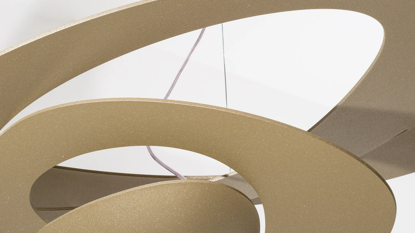 Pirce est composé de disques fins d'aluminium verni qui créent des volutes flottantes, qui retombent vers le bas en produisant des effets magiques de forme et de lumière. La source LED est située dans la coupole. La lumière, dirigée vers le plafond rebondit sur la spirale réfléchissante. Cette suspension habille le plafond de sa présence aérienne et graphique.