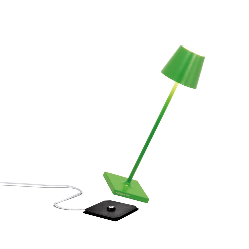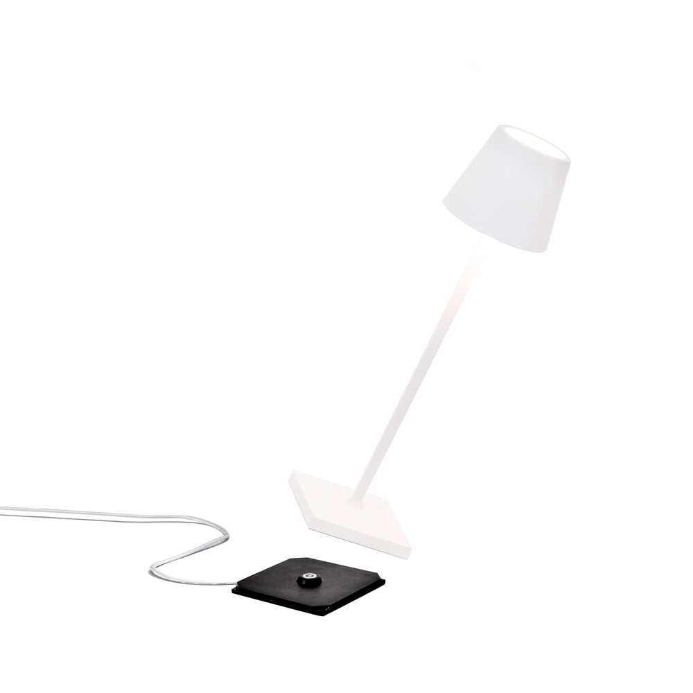 Poldina micro est la nouvelle lampe de table portable qui a les mêmes caractéristiques que Poldina pro mais est réduit en poids et dimensions : seulement 27,5 cm de haut et a un diamètre de 7 cm, plus agile que jamais! Elle convient à l’intérieur et à l’extérieur grâce au haut degré de protection IP65. La gamme de 15 couleurs comprend onze tons classiques et quatre nouvelles teintes : bleu capri, lilas, vert pomme et orange, couleurs vives et audacieuses qui font de Poldina micro une lampe encore plus polyvalente, pour créer des accords ou contraste avec le milieu environnant. Poldina micro est une lampe LED rechargeable à piles qui est allumée et éteinte à l’aide du bouton tactile sur le dessus du diffuseur; le même bouton règle la température de couleur de la lumière (2200, 2700 ou 3000K) et l’intensité du flux lumineux. Poldina micro se recharge en 3-4 heures sur la base de contact spéciale (fournie); la batterie dure plus de 7 heures. La structure en aluminium moulée sous pression est peinte ou traitée avec une finition galvanique en or brillant ou chrome. L’utilisation continue à l’extérieur n’est pas recommandée pour les lampes avec une finition galvanique.