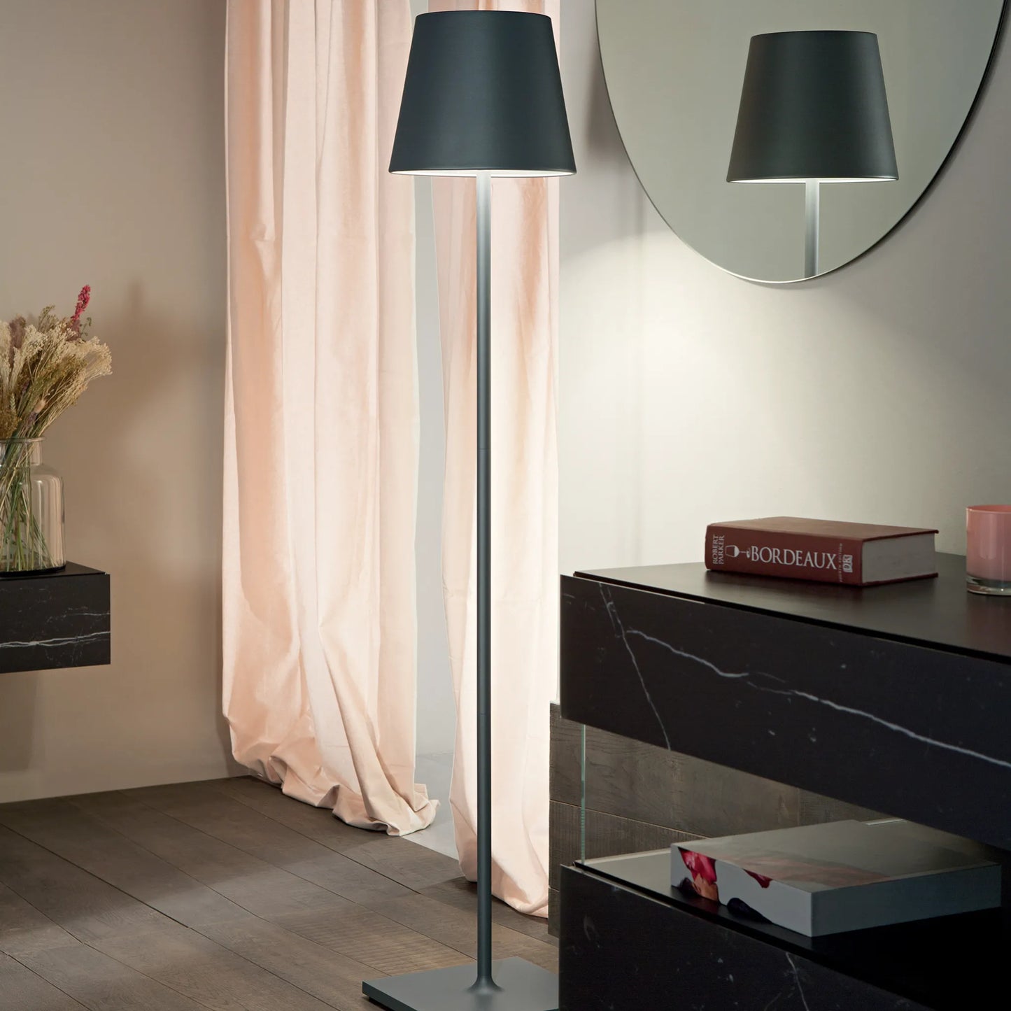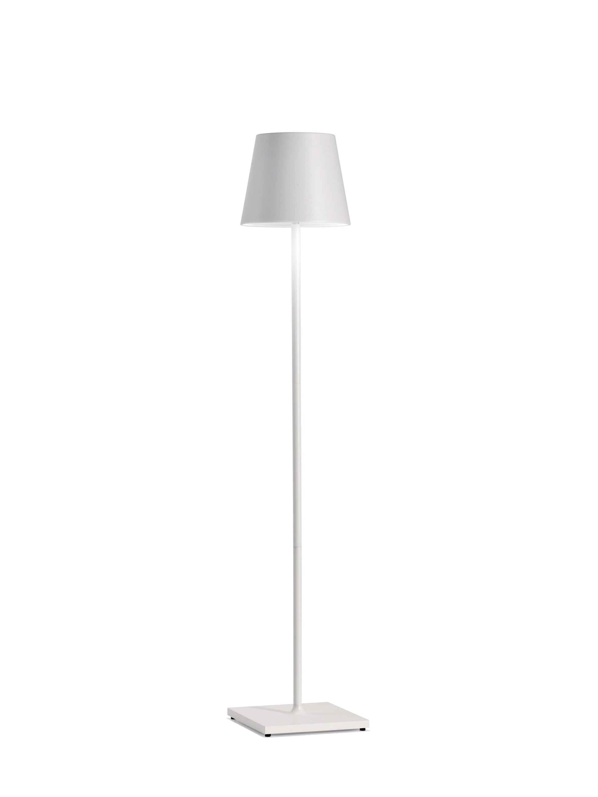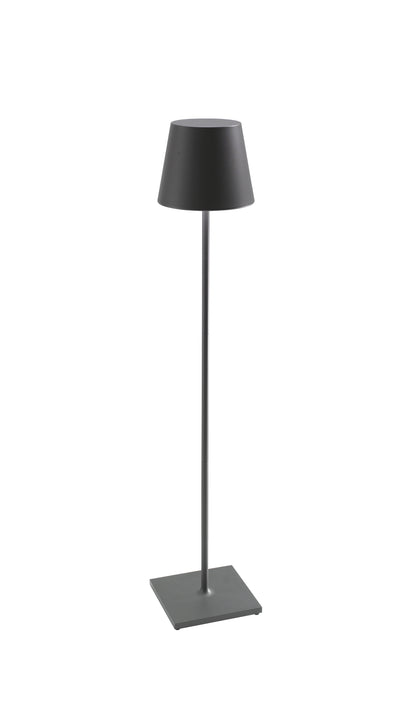 Poldina XXL pro est une lampe de sol et de table portable et rechargeable, avec base de chargement par contact, corps en aluminium peint, diffuseur en polycarbonate et source lumineuse à LED. La lampe est allumée et éteinte par un bouton tactile situé sur le dessus du diffuseur, avec le même bouton, il est possible de diminuer l'intensité du flux lumineux et de régler la température de couleur de la lumière, en choisissant entre 2700 et 3000K. Elle est équipée d'un kit de 3 tiges qui vous permet de régler la hauteur de la lampe de 69 cm à 150 cm maximum.