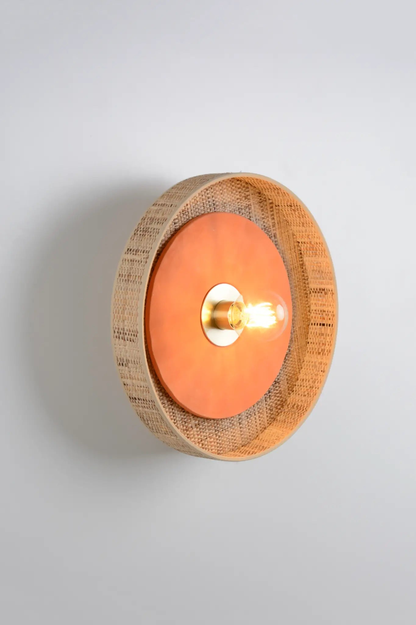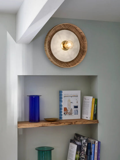 Applique murale au design cylindrique en bana, équipée d’un disque en céramique bosselée mate et d’une patère murale en métal adaptable DCL. Un luminaire élégant et raffiné, parfait pour une ambiance chaleureuse.
