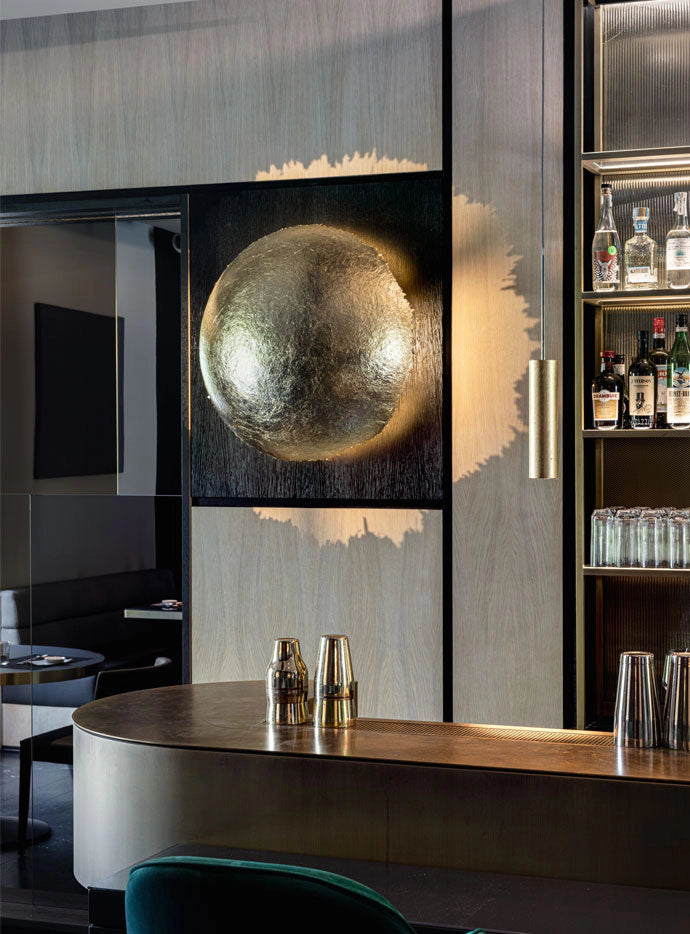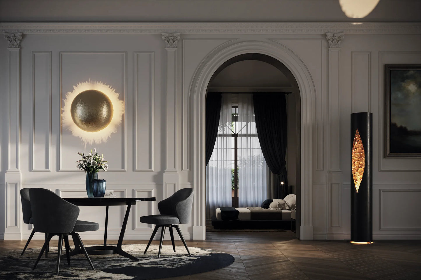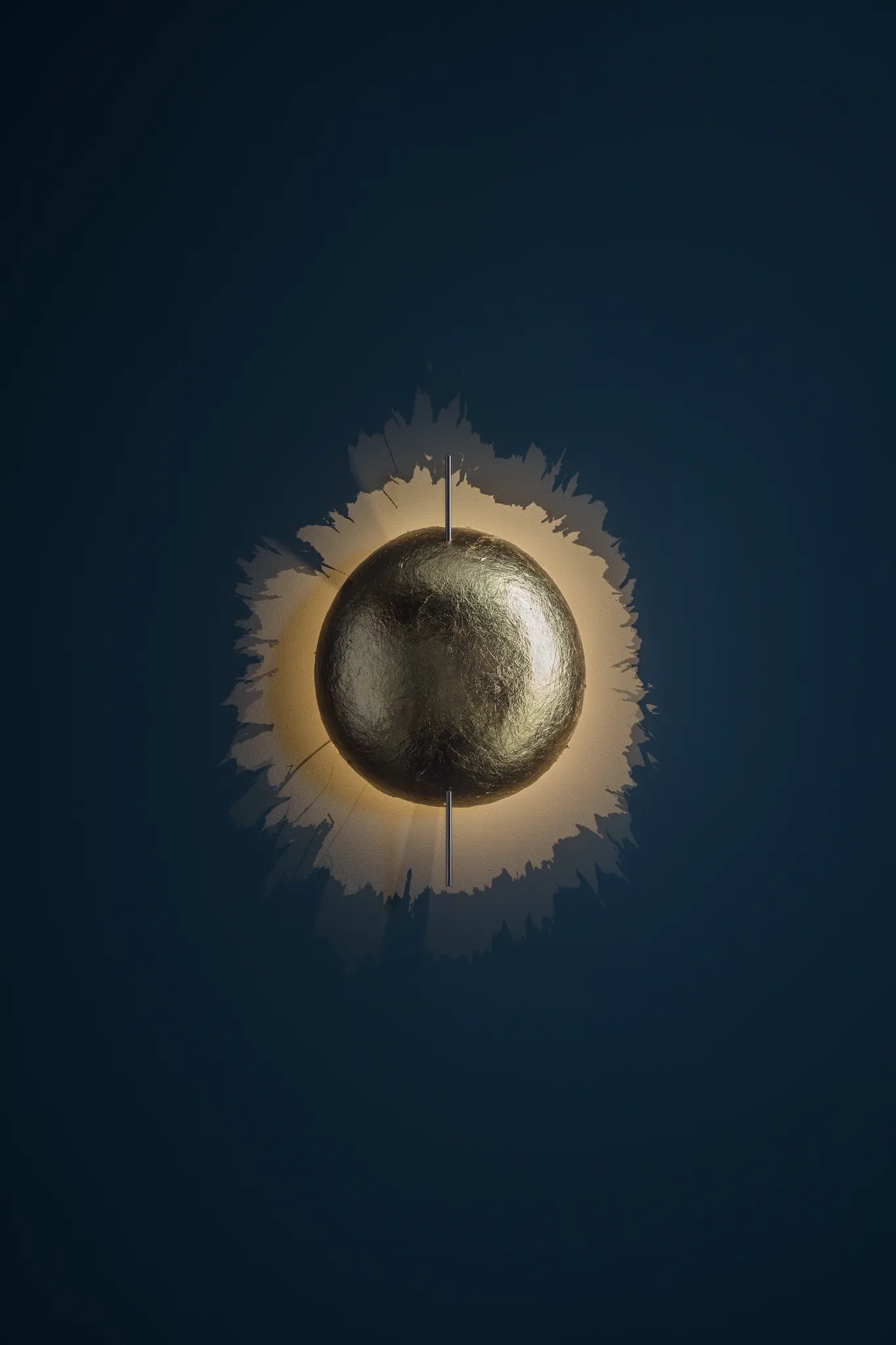 La lampe PostKrisi CW 70 est un plafonnier ou une applique avec une structure en métal, un diffuseur en fibre de verre recouvert de feuilles d'or ou d'argent. L'abat-jour a la forme d'un hémisphère et est en fibre de verre. La lumière est émise vers le mur ou le plafond.