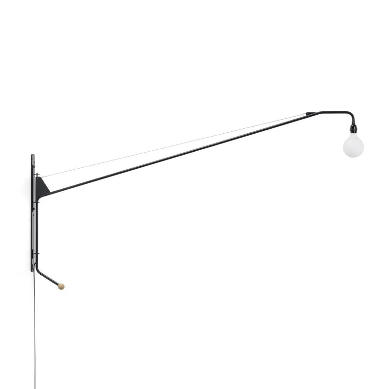 La lampe murale Potence est l'un des chefs-d’œuvre puriste de Jean Prouvé. Réduite à l'essentiel - une ampoule et une attache murale pivotante - la lampe à long bras oscillant est réalisée en acier tubulaire à la finition époxy et comporte une poignée en chêne. La lampe est commandée par un cordon variateur et est équipée d'une ampoule. Jean Prouvé a créé la première version de la lampe murale Potence pour sa propre maison à Nancy dans les années 1940 : une simple ampoule fixée à une longue barre pivotante en acier, maintenue par un fil d‘acier. Cette création épurée et fonctionnaliste a rapidement été produite en différentes tailles, avec une poignée supplémentaire sur les modèles plus grands pour faciliter le mouvement pivotant.