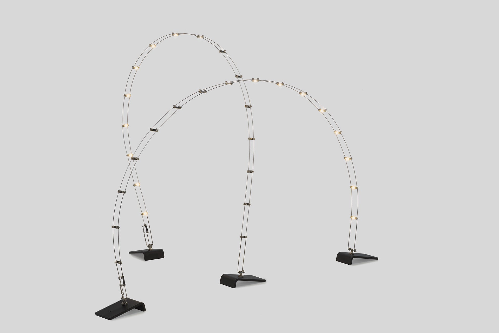 Une montagne russe de lumière, créez votre attraction préférée. Le luminaire Raven est flexible et possède des aimants aux deux extrémités. Placez-le sur les 2 bases peintes en noir ou collez-le sur un sol en acier. Le luminaire est fourni avec une prise USB 220V.