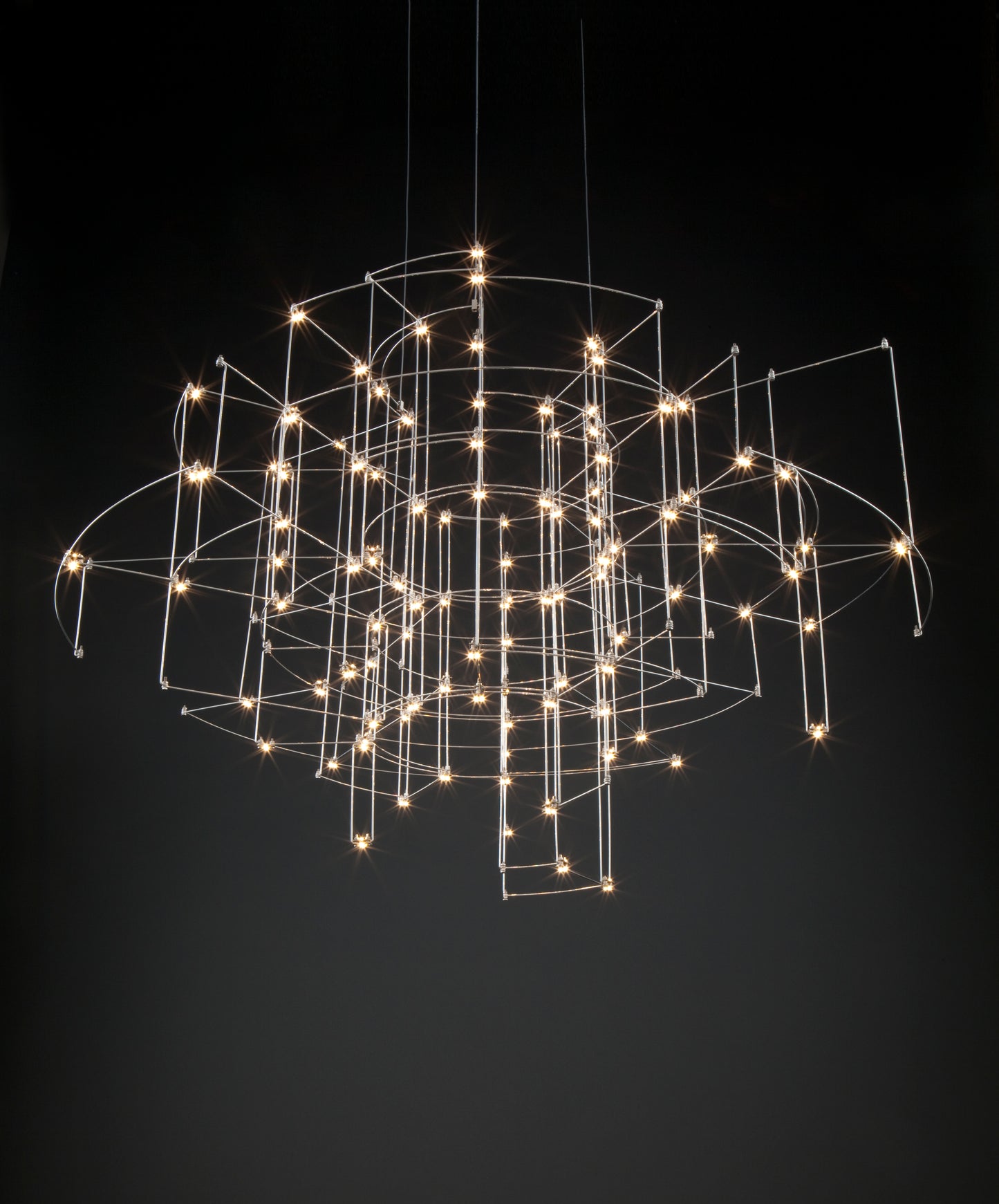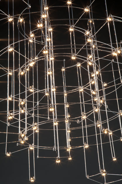 La suspension Spectre reprend les codes de la Orion en version arrondie: plus adaptée à un éclairage de salon, une chambre ou une entrée, elle apportera du cachet à votre décoration, un subtil scintillement de lumière grâce à ses nombreuses leds, et une originalité incomparable en terme de design.