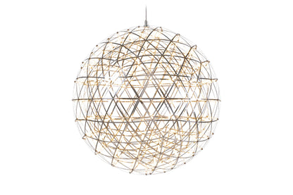 Abat-jour constitué de deux sphères métalliques superposées, reliées entre elles par 162 LED. Les fils d'acier poli servent de conducteur (courant électrique très basse tension). Le câble d'alimentation est transparent.