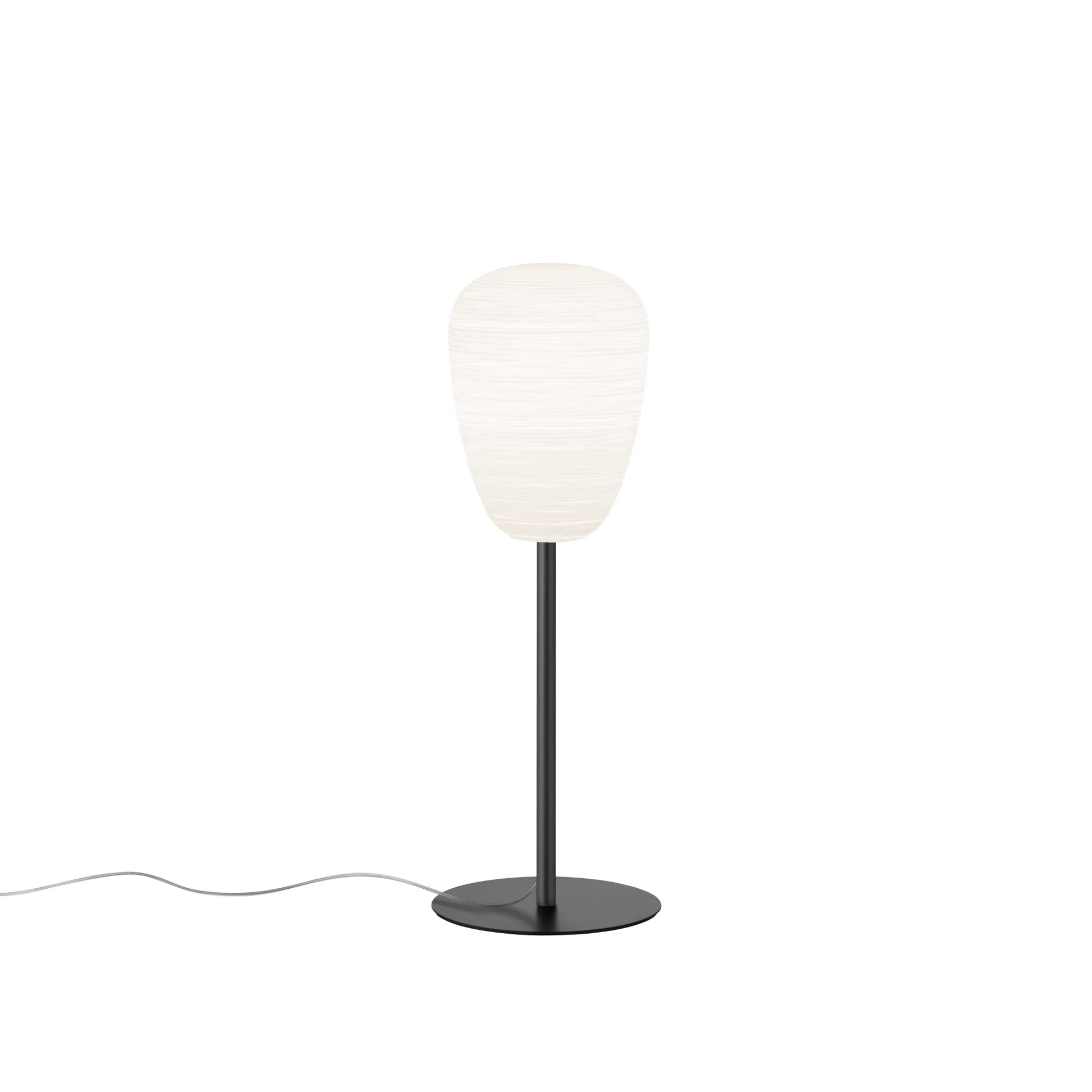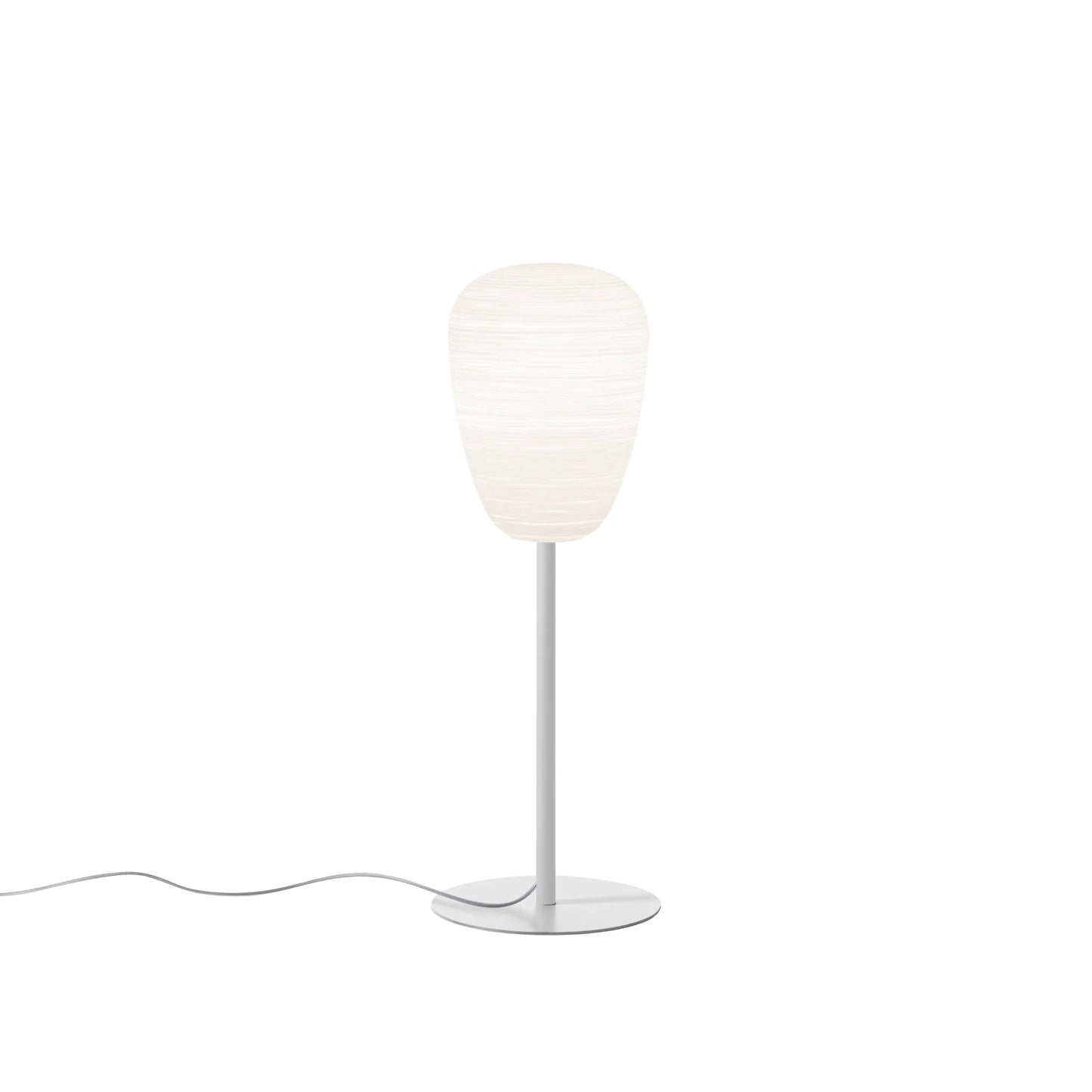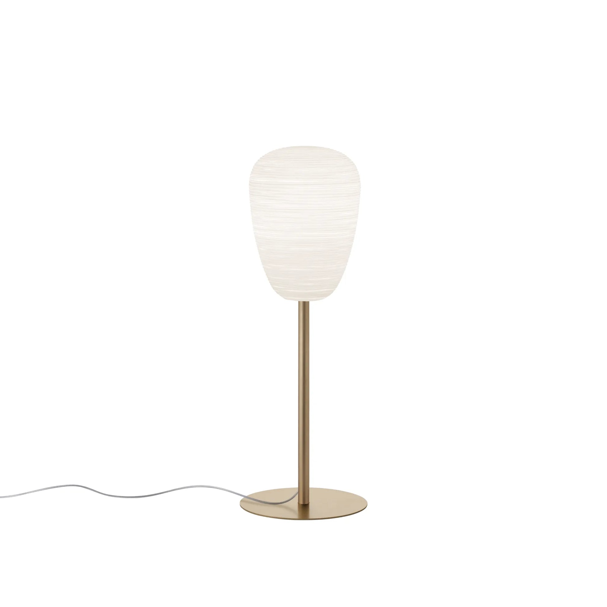 Lampes de table à lumière diffuse. L'effet rayé est obtenu à l'aide d'un moule négatif présentant les décorations qui sont reproduites à la surface du verre. Le verre est ensuite dépoli manuellement à l'aide d'une «bande» et traité à l'acide afin de créer l'effet gypseux. Le diffuseur repose sur un pied qui est proposé en 3 couleurs: blanc pour la sobriété, doré pour une touche glamour, et gris graphite pour une ligne plus marquée.