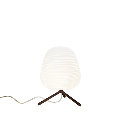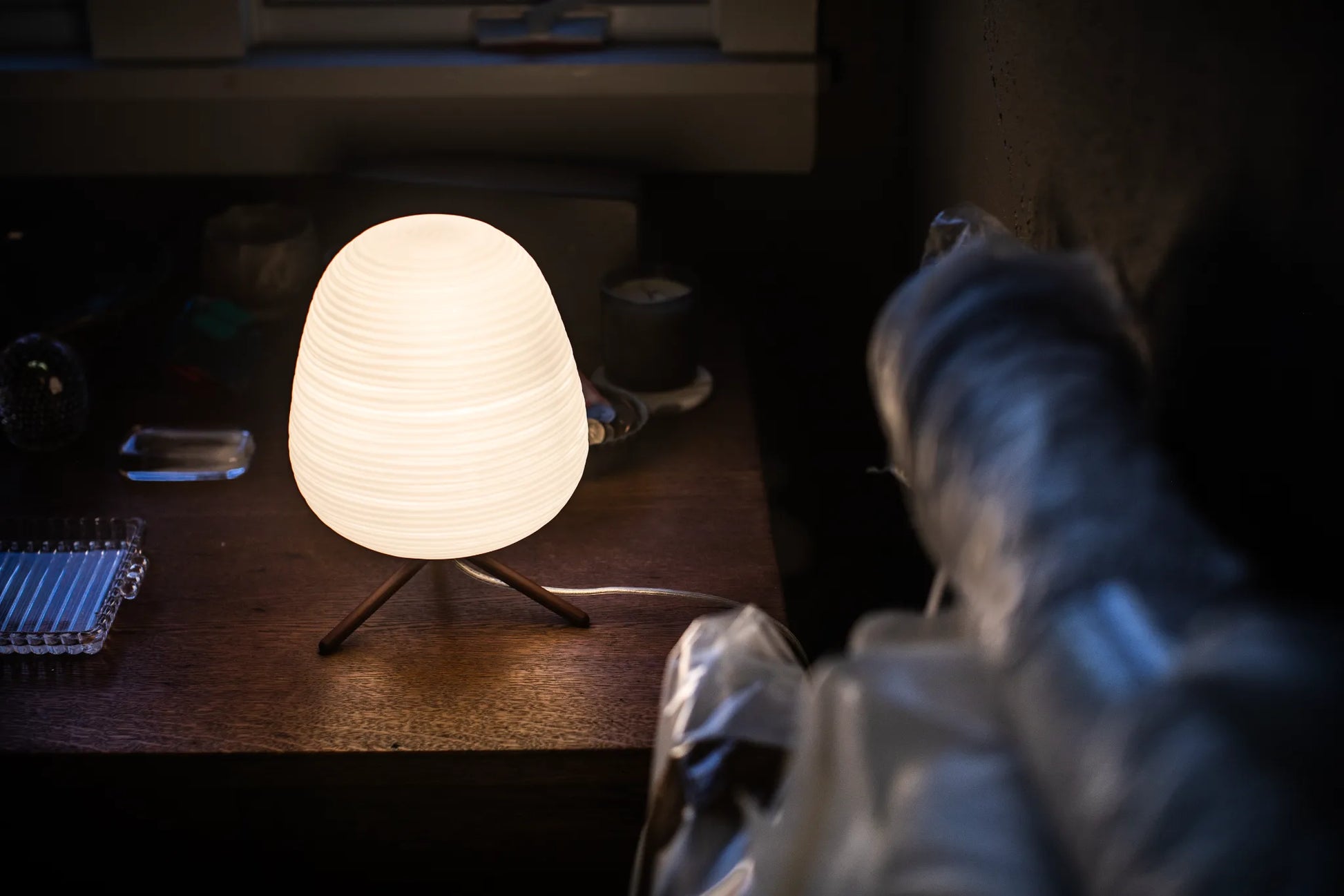 Lampes de table à lumière diffuse. Collection de trois formes de diffuseur en verre soufflé à la bouche, selon une méthode de soufflage sans centrifugeage dans le moule («à l'arrêt»). L'effet rayé est obtenu à l'aide d'un moule négatif présentant les décorations qui sont reproduites à la surface du verre. Le verre est ensuite dépoli manuellement à l'aide d'une «bande» et traité à l'acide afin de créer l'effet gypseux. Le diffuseur repose sur un trépied moulé sous pression en alliage de zinc laqué époxy, avec effet rugueux sur la surface métallique.