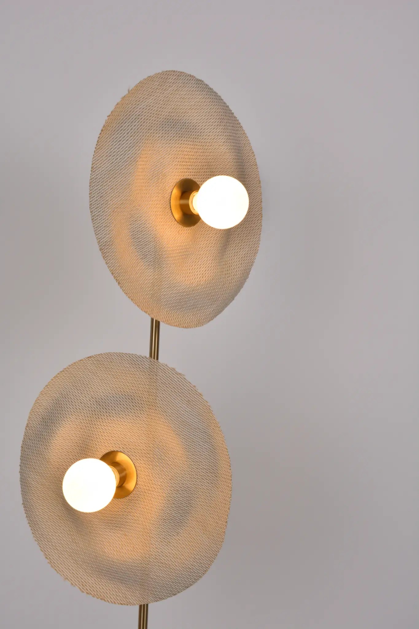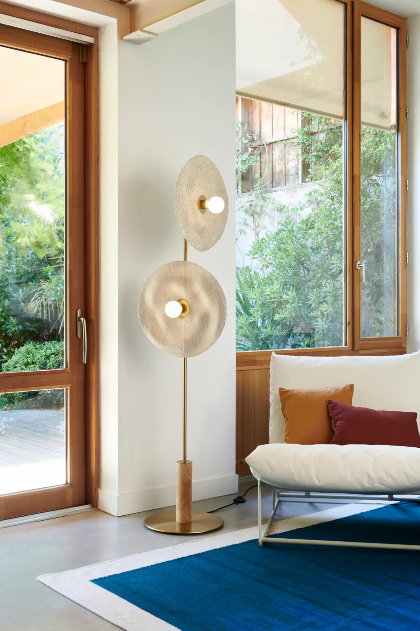 Ses deux abat-jour en forme de pétale, conçus en matière Varian®, créent un jeu de lumière subtil et chaleureux. Ce matériau innovant, alliant fibres naturelles et résine biosourcée, offre à la fois légèreté et résistance, tout en sublimant la lumière d’un éclat doux et diffus.