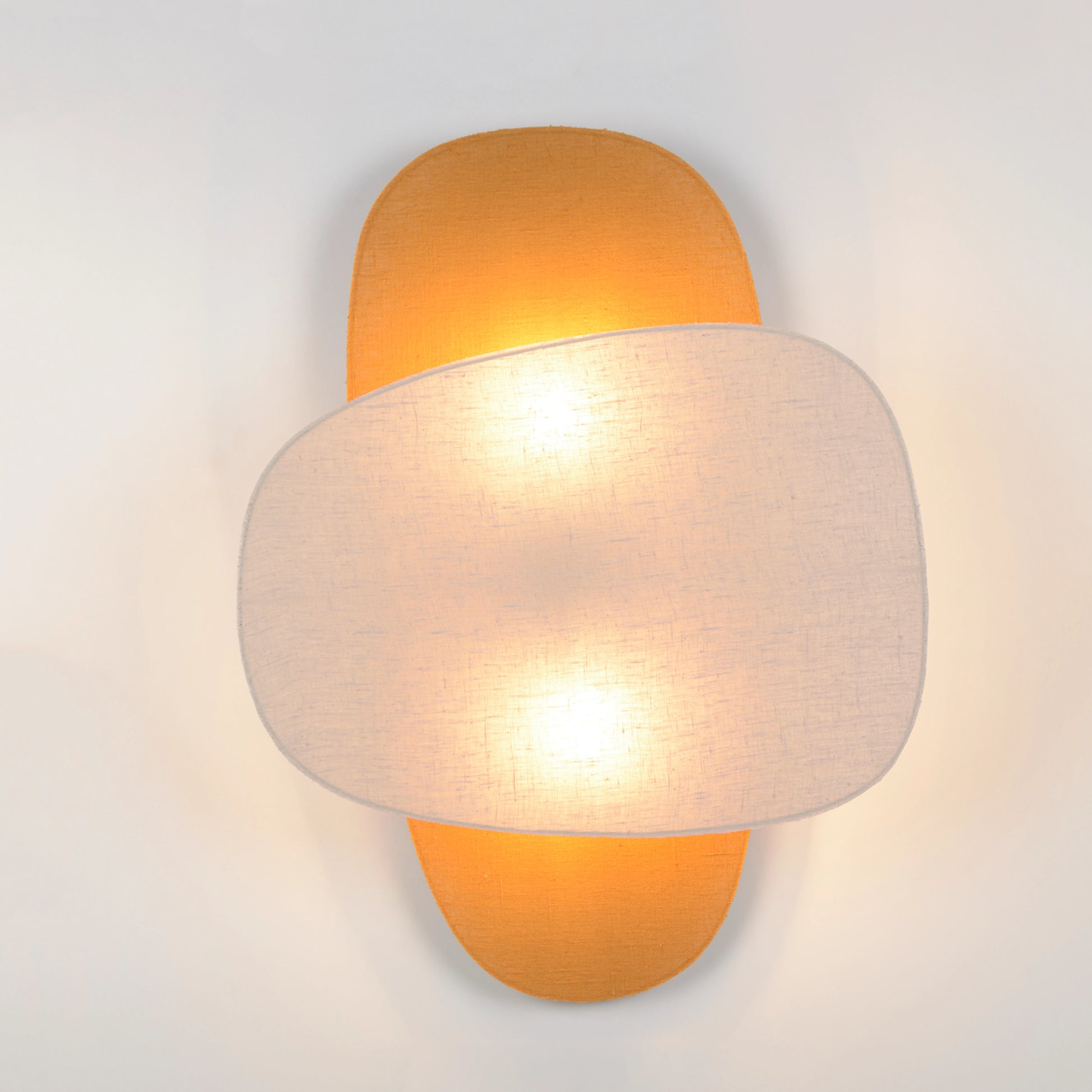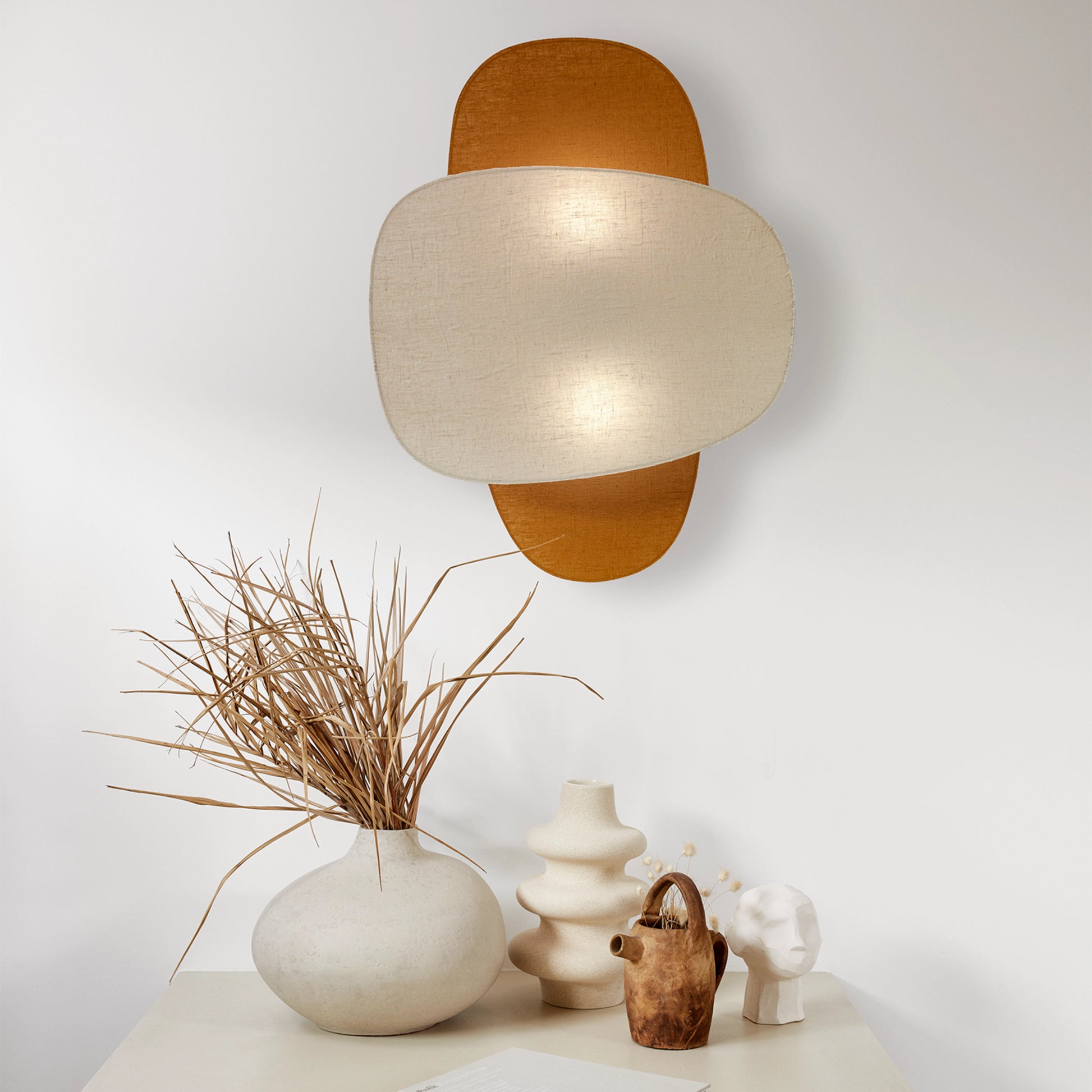 La collection Screen 70's nous fait voyager dans le temps, avec une toute nouvelle forme d’écrans rétro inspirés du design graphique des années 70. Dans un mix inédit de matières toujours plus cosy, cette nouvelle version, dessinée et façonnée dans nos ateliers en France, joue sur un équilibre parfait des couleurs et du contraste chaleureux et indémodable de sa palette de tons de terre. La toile de jute, le lin lavé Curry et le tout nouveau lin Bouleau sélectionnés avec soin sont des tissus 100% lin Européen. Cette applique nécessite l'achat de 2 ampoules.