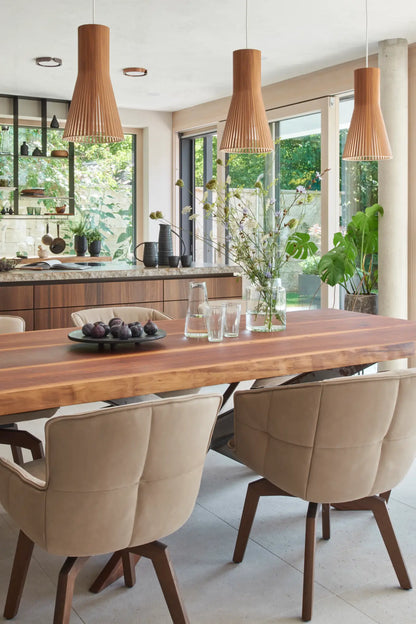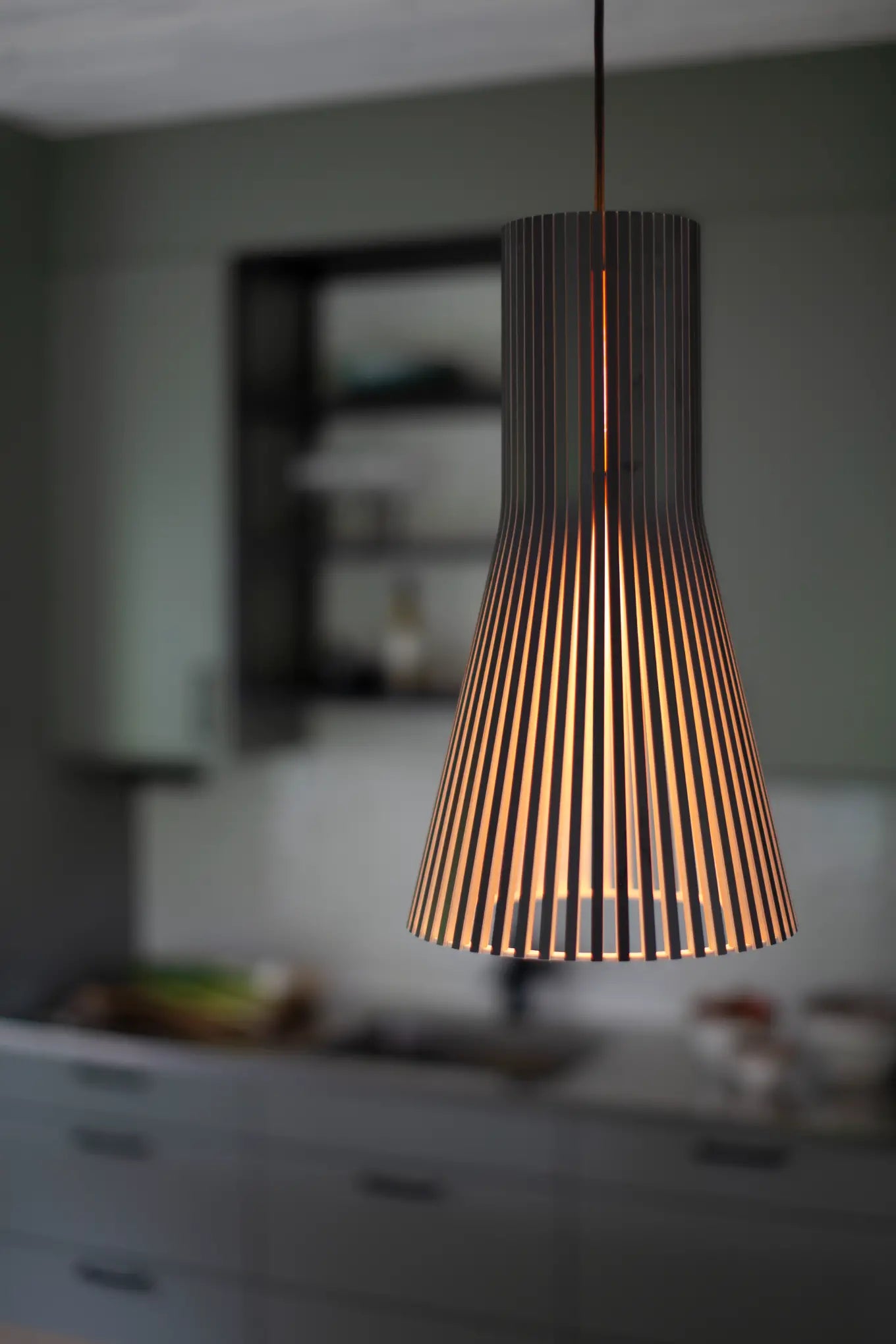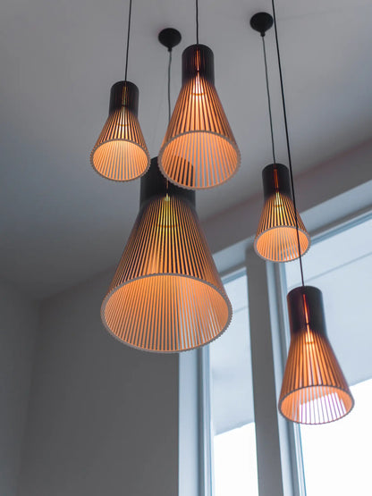 Très belle suspensions Secto Small 4201 qui adopte le design moderne de la marque finlandaise Secto Design, avec des lattes de bouleau et placage de noyer, fabriqué en Finlande.